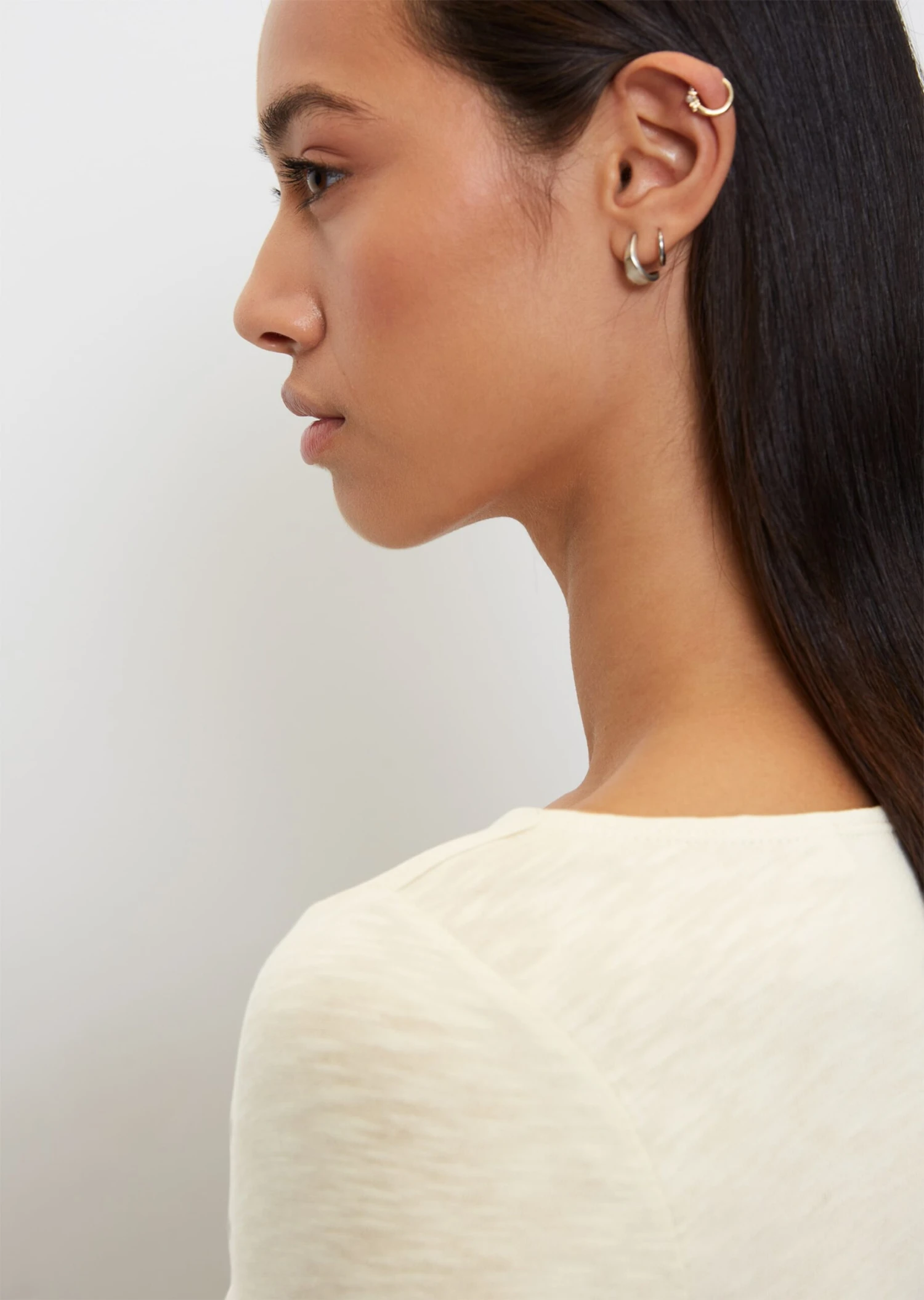 This feminine T-shirt made of pure cotton jersey fabric has the uneven surface that’s typical of slub yarn. Super soft and skin-friendly. Somewhat longer, close-fitting cut with a wide bateau neckline and narrow, mid-length sleeves. This timeless T-shirt is a great wardrobe choice. It’s indispensable for layered looks or can be worn as a strong solo piece.