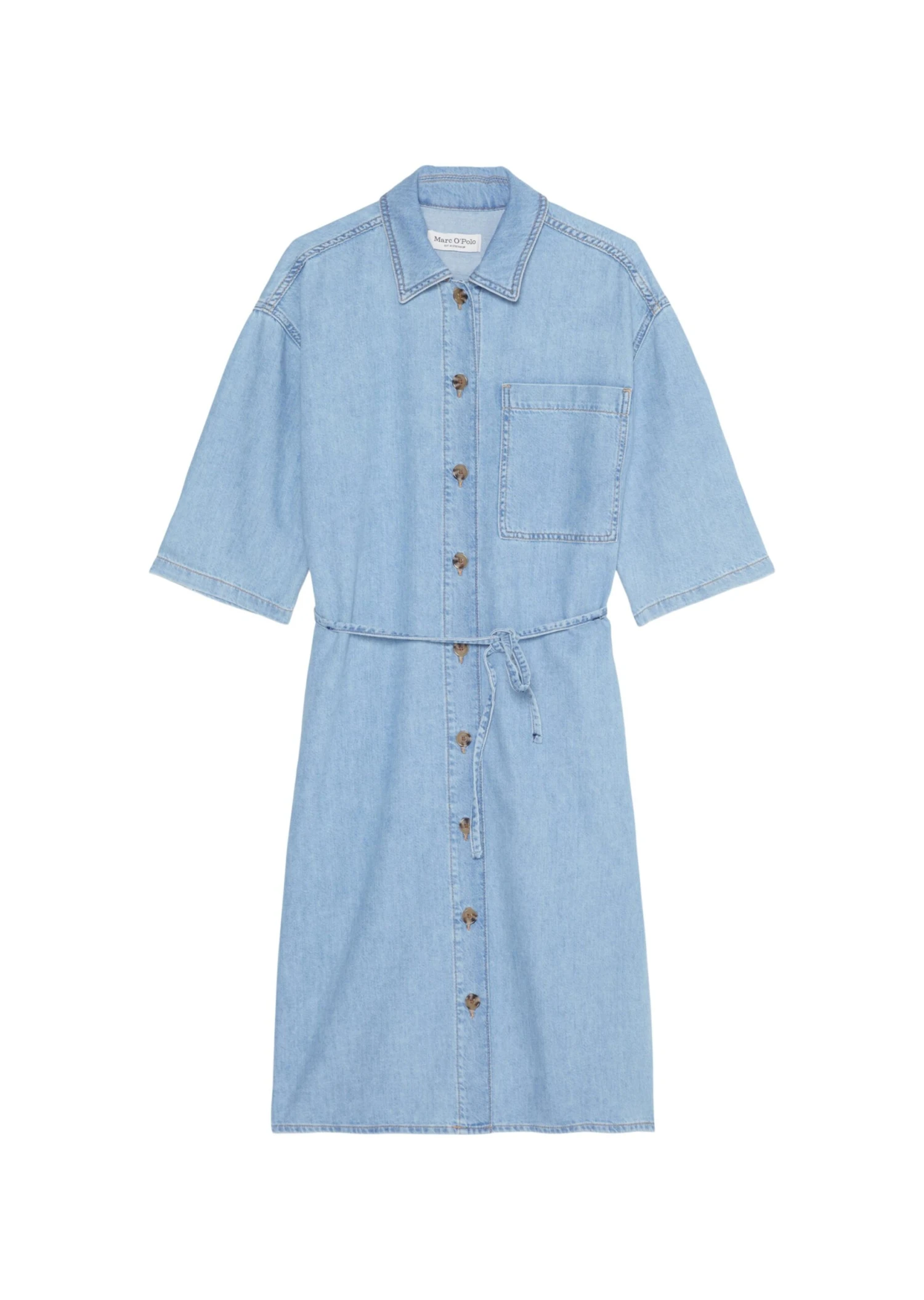 Cool, straightforward and minimalist – perfect attributes for the casual shirt dress made of lightweight, non-stretch denim quality from Organic Cotton-Lyocell mix. The dress has a classic look with turn-down collar, full-length button placket, patch breast pocket and narrow tie belt at the waist. The sleeves are 3/4-length and there are practical seam pockets on the side of the skirt. Tip: the dress also times open as a finish in overshirt style over an existing look.