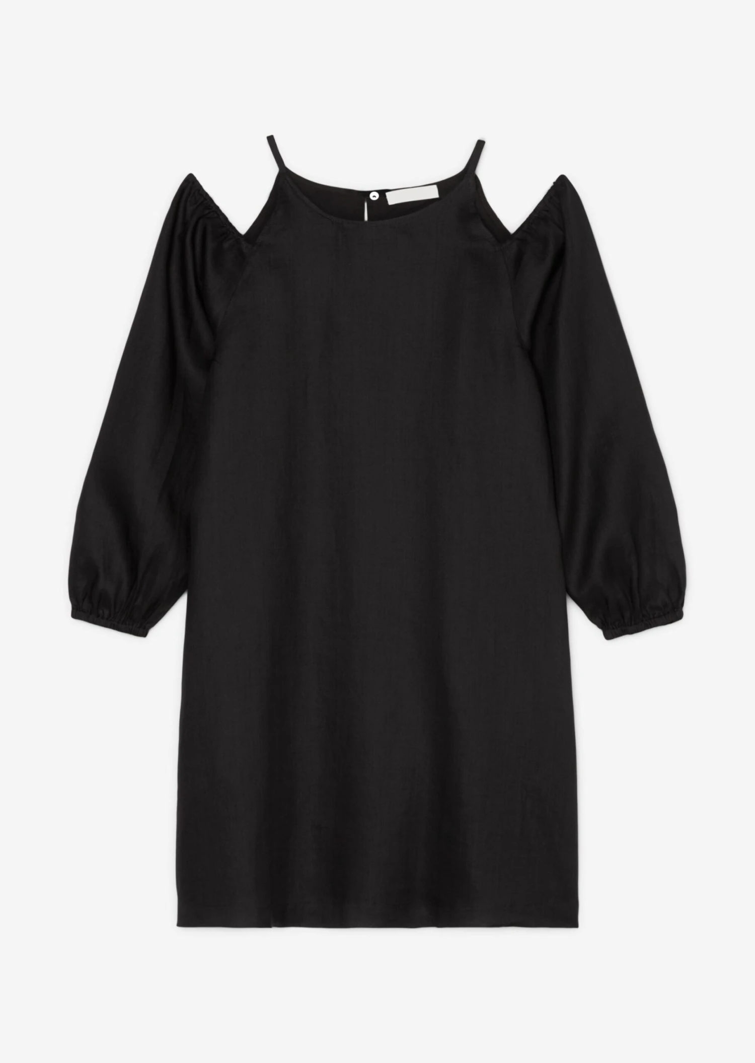 This short, flared A-line dress with cut-out details ensures the maximum wow-effect and puts the focus on your shoulders. Woven in pure Ramie fibre, the material is elegant with a silk-like sheen and is also robust and able to deal with slight wrinkling. The design has short, very thin straps, a “high-fastening” round neckline at the front and back and a button-and-loop fastener at the nape of the neck. The long, Carmen-style puff sleeves are elasticated and gathered at the shoulder and hem. The soft cotton lining ensures breezy comfort in summer. Always the best styling partner: natural, lightly suntanned skin.