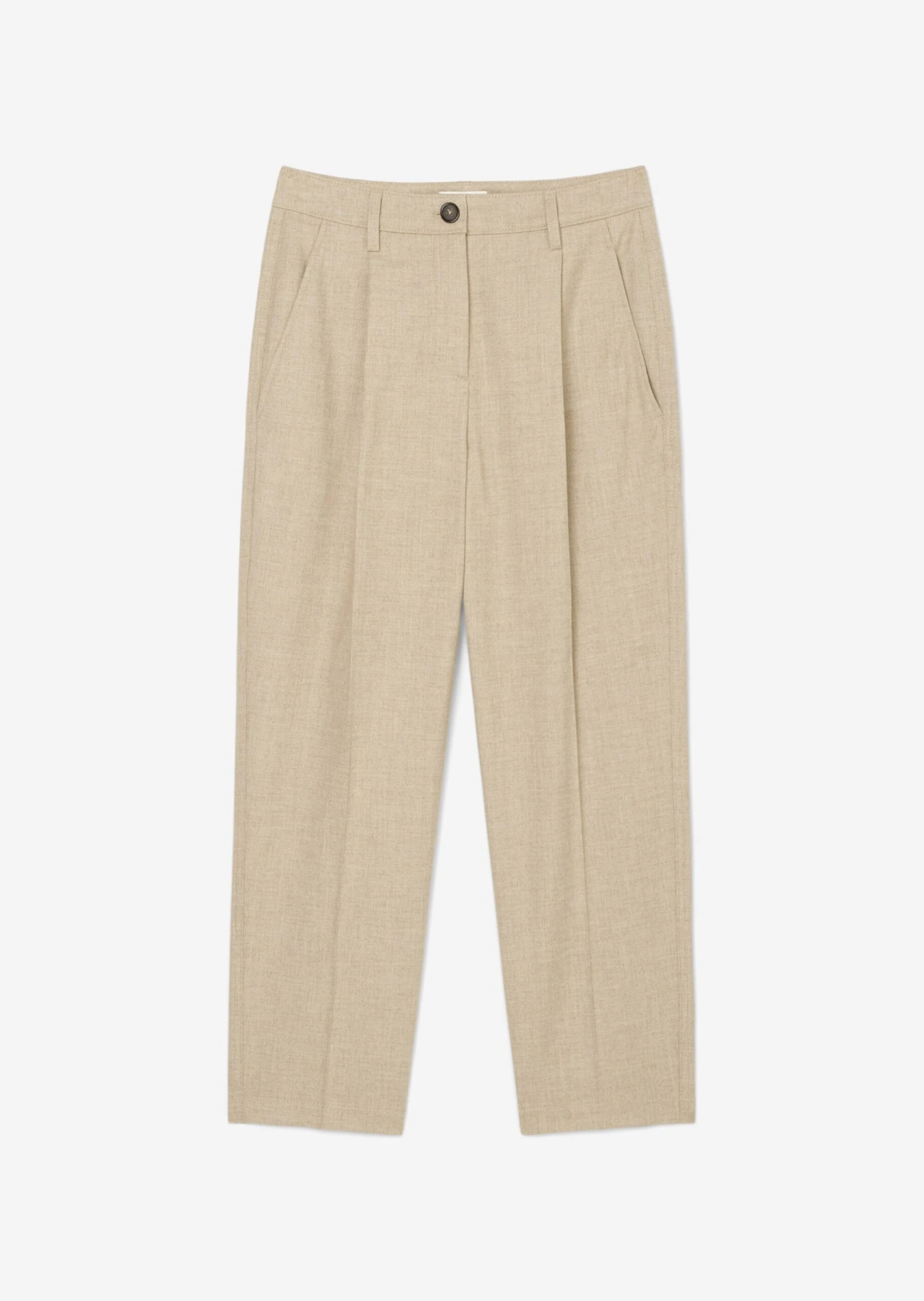 Trendy Tailored Pants – this feminine model combines classic elements of men’s tailoring with modern design. A confident look in high-quality, yarn-dyed and finely patterned flannel quality with a loose tapered fit leg, normal waist fit, slanted front welt pockets, waistband with overlap solution, deep, casual pleats and narrow welt pockets on the back. The length is slightly cropped. Features a variety of timeless patterns – from classic plaid, to pepita, to herringbone.