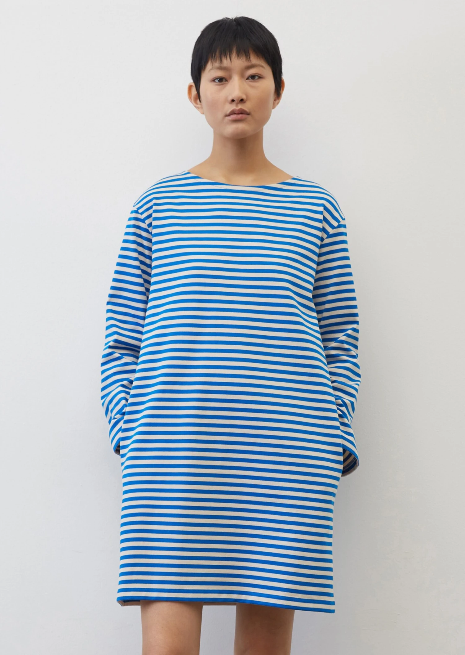 This relaxed go-to dress with a classic striped pattern is perhaps the most casual fashion trend for the approaching warmer months. The fashionable basic piece looks both feminine and sporty and is an effortless styling all-rounder. The short, slightly flared cut highlights the casual character of this trend piece. The jersey dress is made of pure, yarn-dyed organic cotton heavy cotton jersey and has a bateau neckline, dropped shoulders and practical, in-seam slit pockets on the sides.
