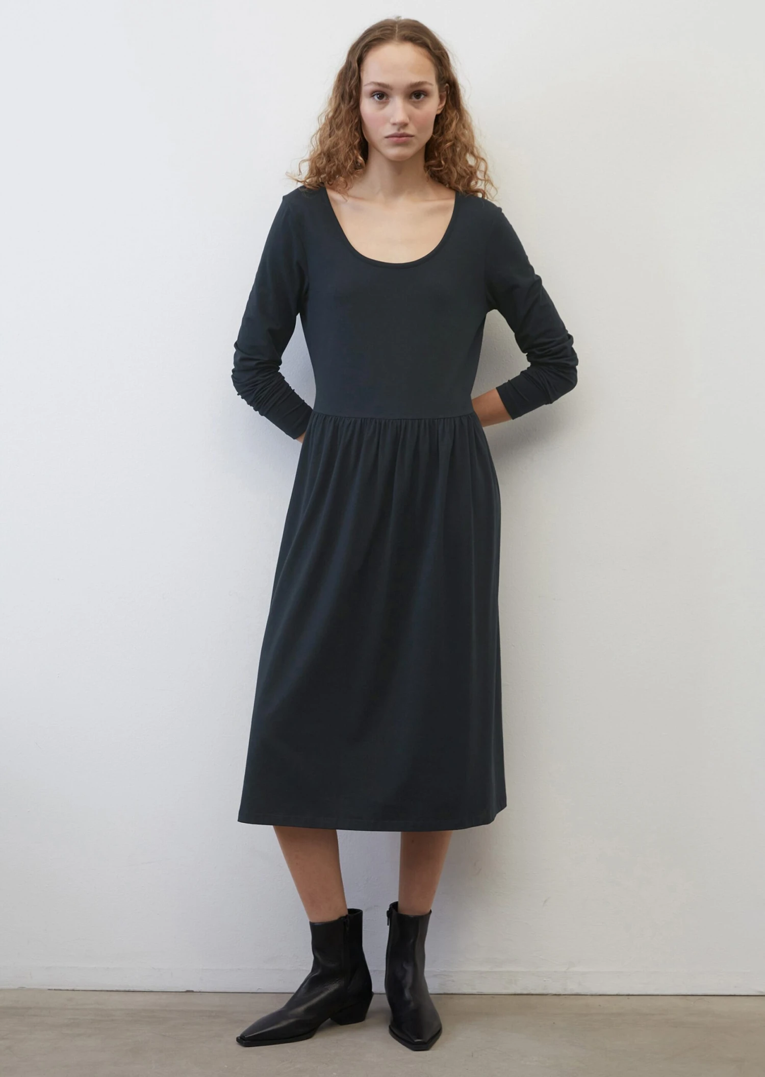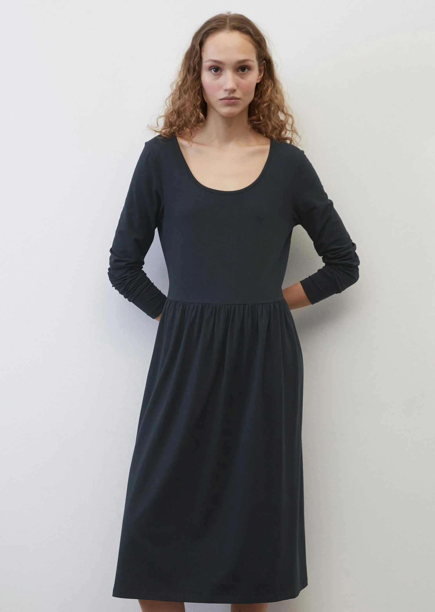 This casual and elegant jersey dress combines two trends in one. The first trend – dresses with a wide skirt! And the second – dresses made of soft, high-quality materials. It looks super chic paired with a blazer and cool trainers. This dress has a close-fitting upper section with a wide round neckline and long, slim sleeves, plus a loose, flared skirt with a gathered joining seam at the waist It is made of super soft, flowing jersey in a stretchy blend of modal and organic cotton.