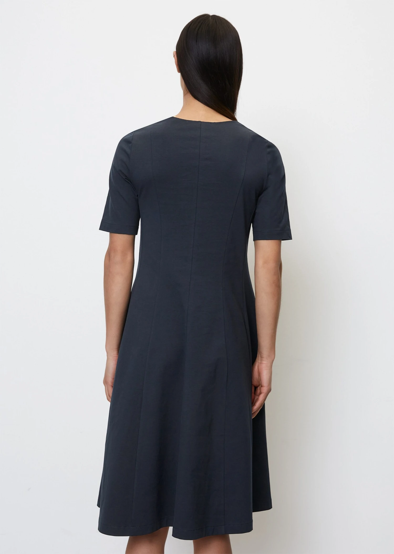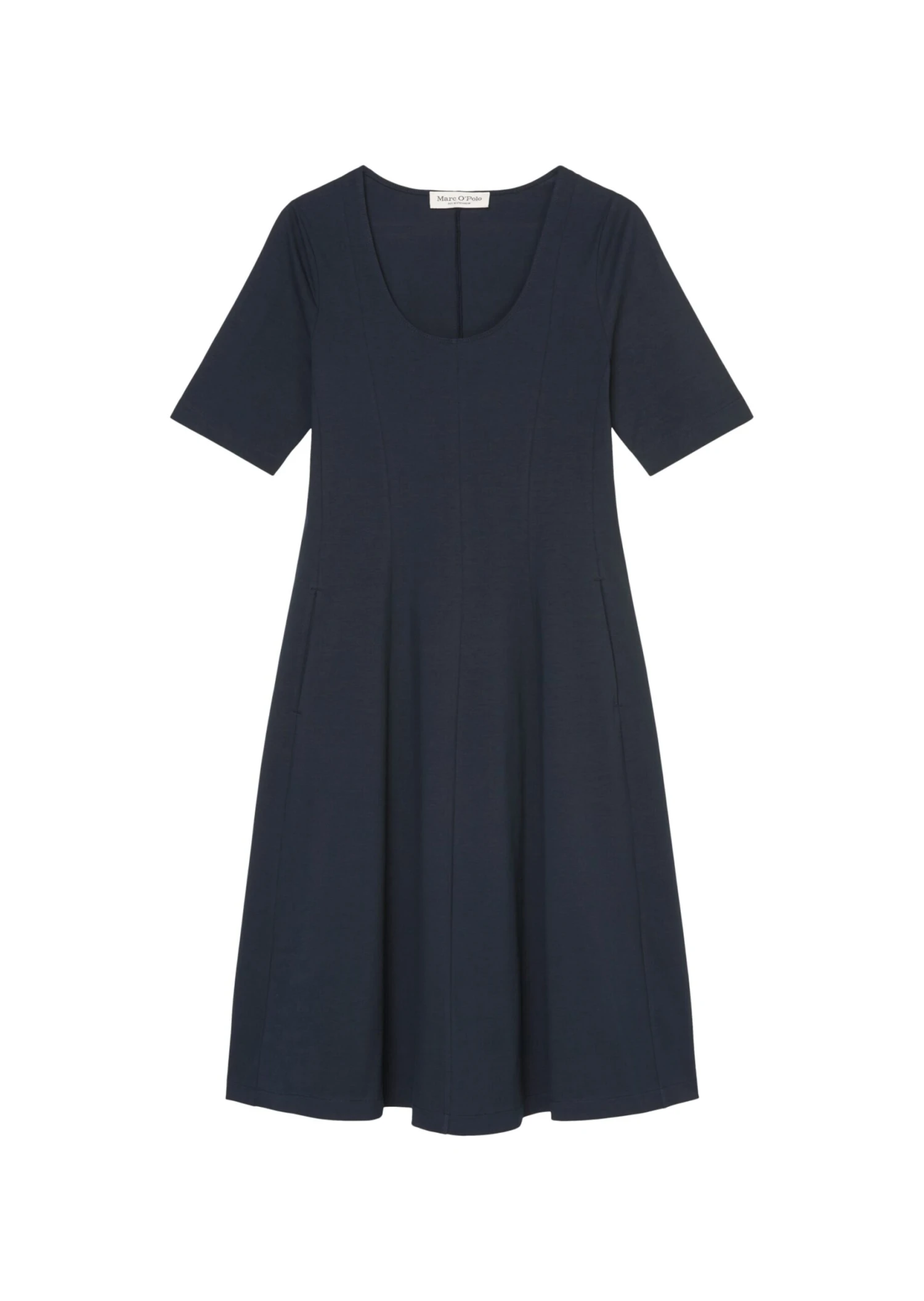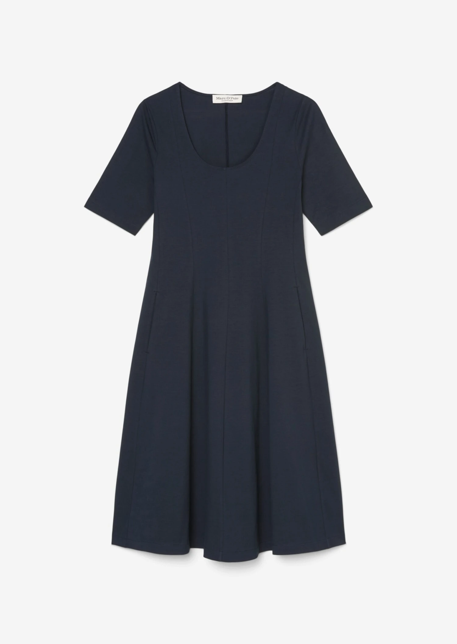 A wardrobe staple for anyone that knows their way around fashion: a stylish stretch jersey dress with a flared skirt. Shaped-fit with dividing seams made of a soft, stretchy organic cotton blend. The styling possibilities are endless – never straying far from casual sporty. With a generous, wide neckline, mid-length sleeves and practical in-seam slit pockets. Comfy: this model does not have a fastener; simply slip it on and you are good to go.