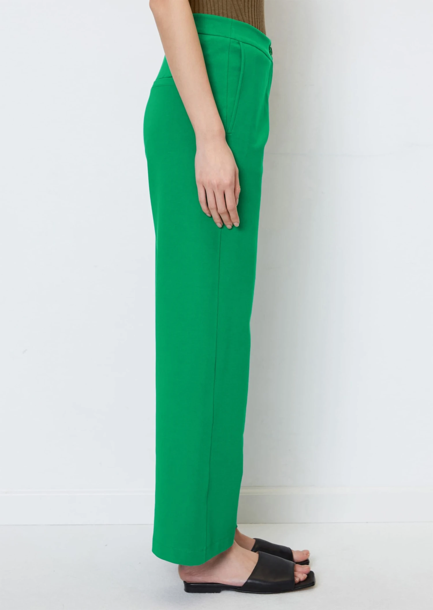 Comfier than skinny jeans, more elegant than chinos and in a casual, comfy chic style. These elegant, sporty interlock jersey trousers are made of high-quality, stretchy organic cotton. They come in a classic, straight fit with a slightly flared, subtly cropped, ankle-length leg. They have a regular-rise waist, set-in waistband, dart details, slanted slit pockets on the front and one piped pocket on the back. Style with the matching jersey blazer for the office.