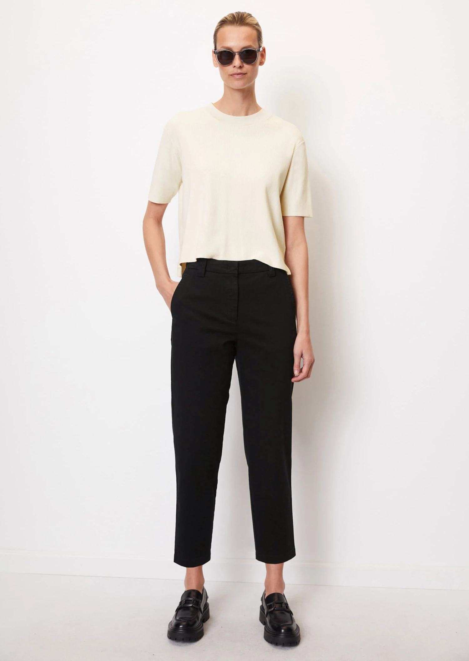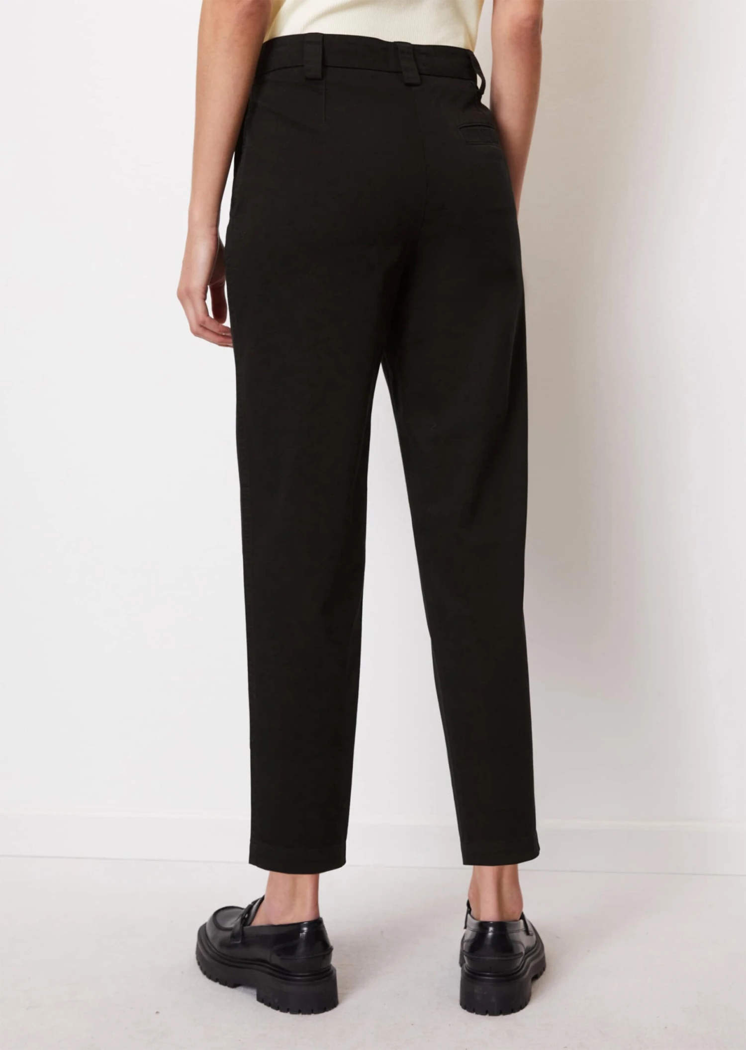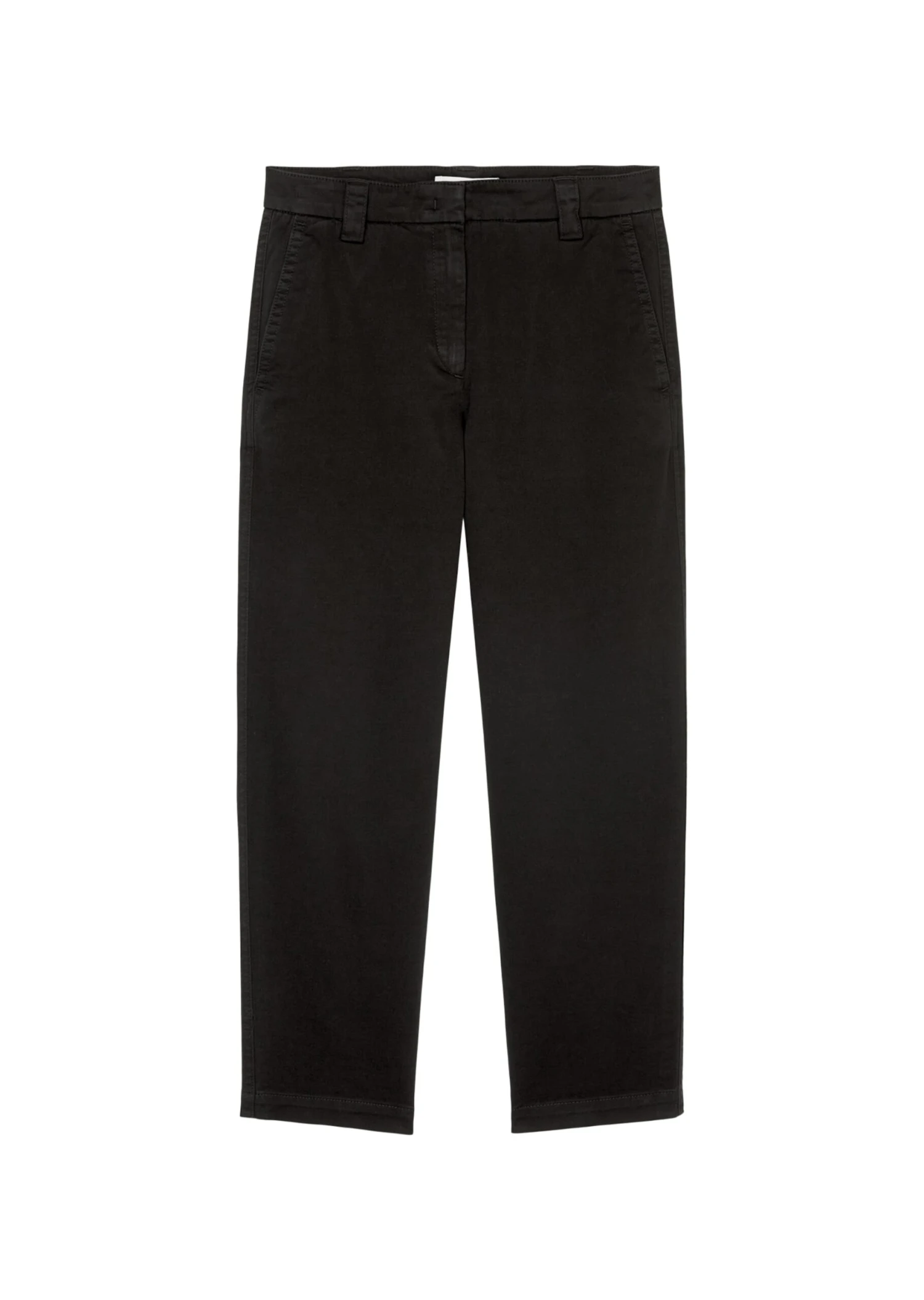 Comes in a modern, clean design and a new cut: the KALNI chinos in high-quality organic stretch cotton twill. Casual, modern O-shape design with a high waist. This new fit creates a slim waist, features a flattering loose leg and elongates the appearance of the leg thanks to the cropped length. The features: a simple waistband with a concealed fastener, wide belt loops, diagonal front slit pockets and one narrow piped pocket on the back.