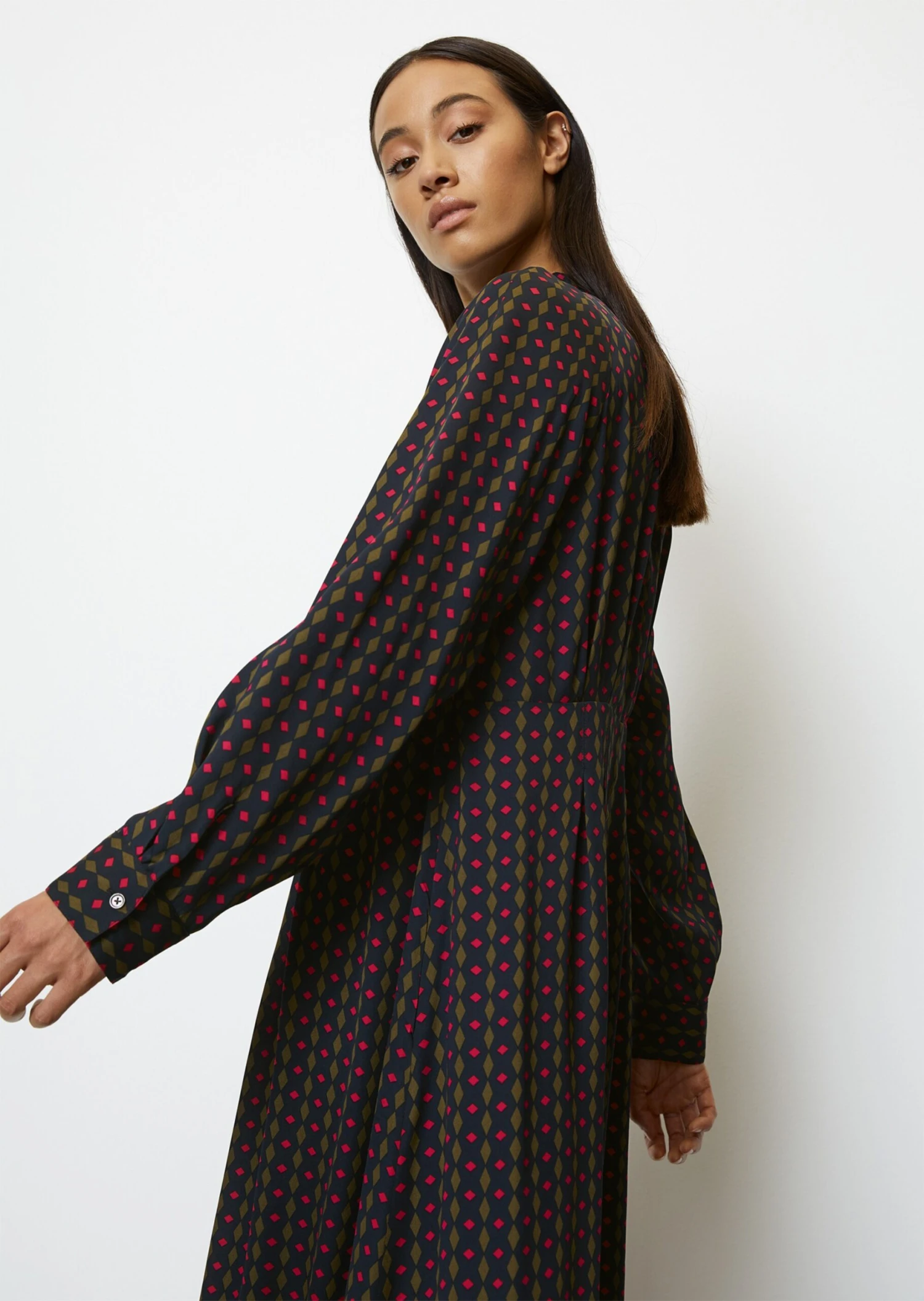 Long dresses are the perfect garments if you want to transport the summer fashionably into the fall and winter. There is hardly a dress which can be combined so easily and comes in so many outfit variations as this dress. It is made of high quality, flowing viscose and the flared skirt part is lined from the waist. The cut: relaxed with figure-hugging waist and side seamless zipper. The dress has a stand-up collar, a half concealed button placket, sophisticated raglan sleeves with cuffed ends and striking pleat details at the center of the body.
