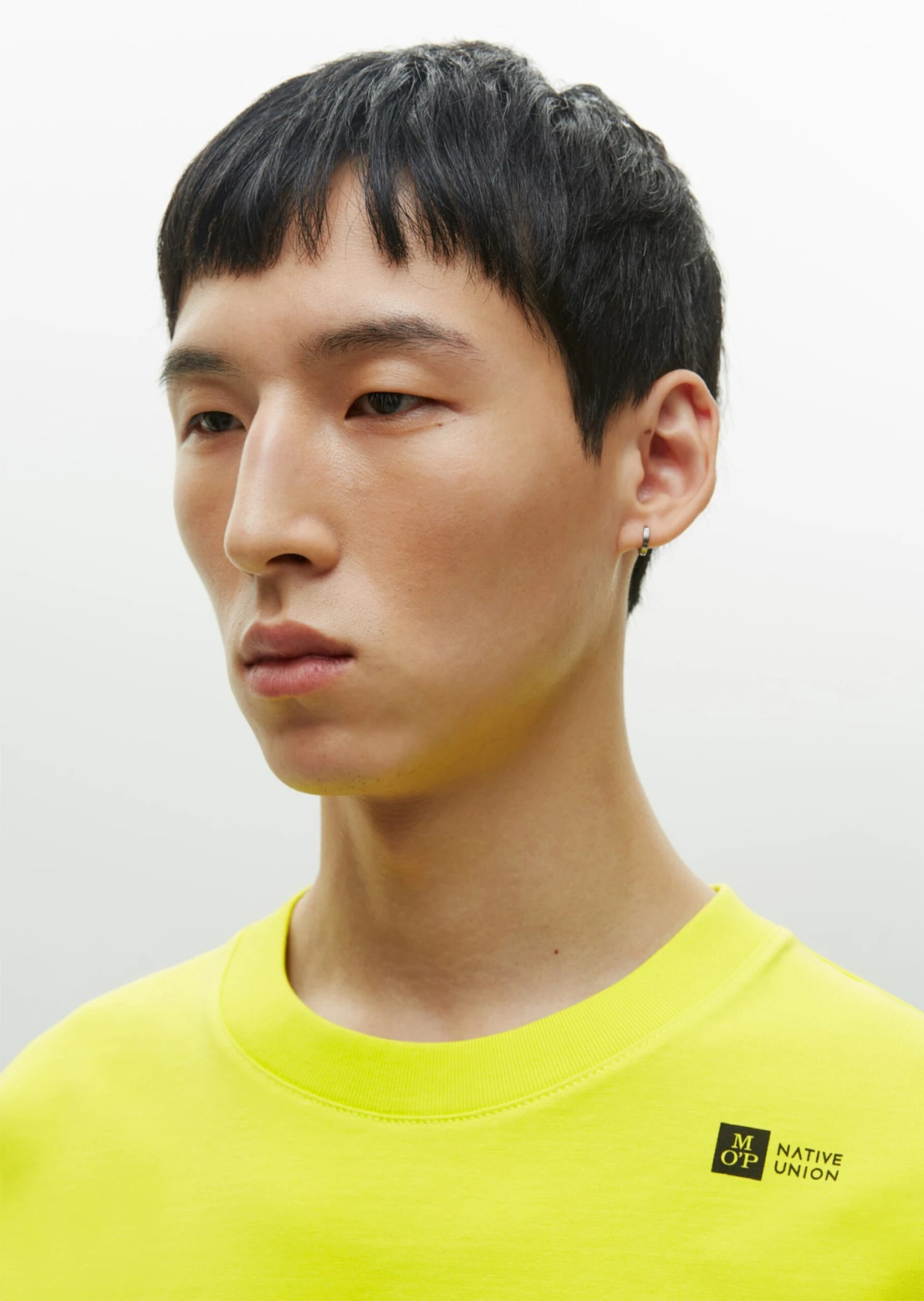 MO’P x NATIVE UNION. A forward-thinking fusion of textile and technology. Sustainable design with Scandinavian spirit. This high-quality T-shirt has a small logo positioned high up on the front and a striking print on the back. The piece is made of heavy jersey composed of pure organic cotton for exceptional comfort. It comes in a very loose, relaxed fit with a classic round neckline, short sleeves, slightly dropped shoulders and a straight hemline. The T-shirt runs large.