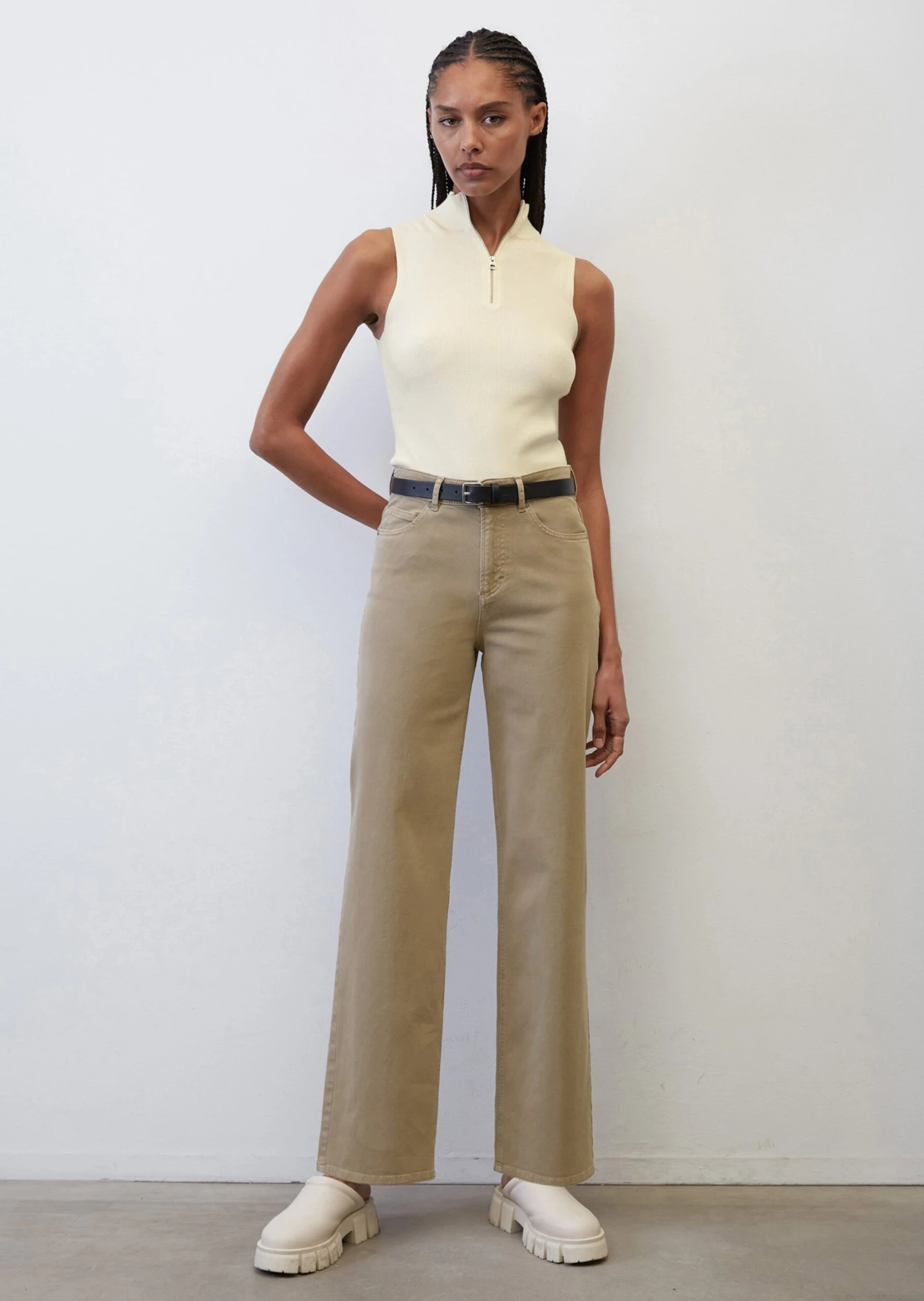 Together, they create the perfect 90s retro look and stand for comfort and casual style: wide-leg trousers and sleeveless tops. The NELIS wide trousers are finished in authentic, high-quality and softly brushed stretch twill fabric made of organic cotton. They come in a high-waisted fit with a wide, straight leg in a regular length. The classic five-pocket design features colour-coordinated stitching and a genuine leather label. The high-waisted cut and wide, figure-flattering leg ensure the perfect fit. Runs a bit small – we recommend ordering one size up.