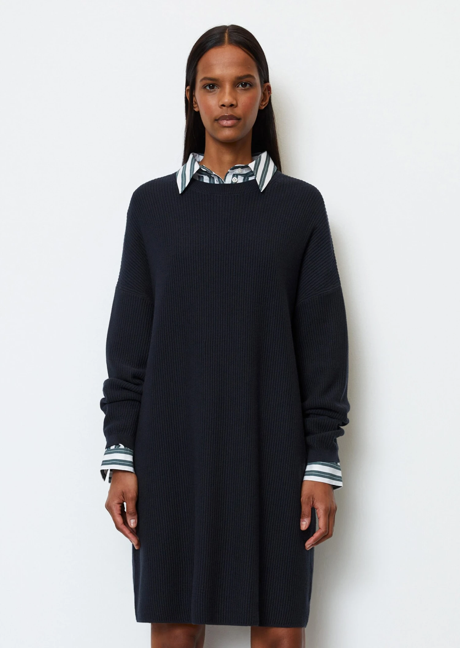 One of the most casual and sporty all-round geniuses of the knitwear season: the cleanly designed oversize knitted dress with a modern rice grain rib pattern. The material: an exclusive, pure organic cotton yarn quality. The cut: feminine loose, straight, with strongly overlapped shoulders, knee-length and without side seam slits. The neckline: a classic, finely ribbed round neck. A noble, timeless basic piece that suits many different occasions and can be worn in every season. Runs large – we recommend ordering one size smaller.