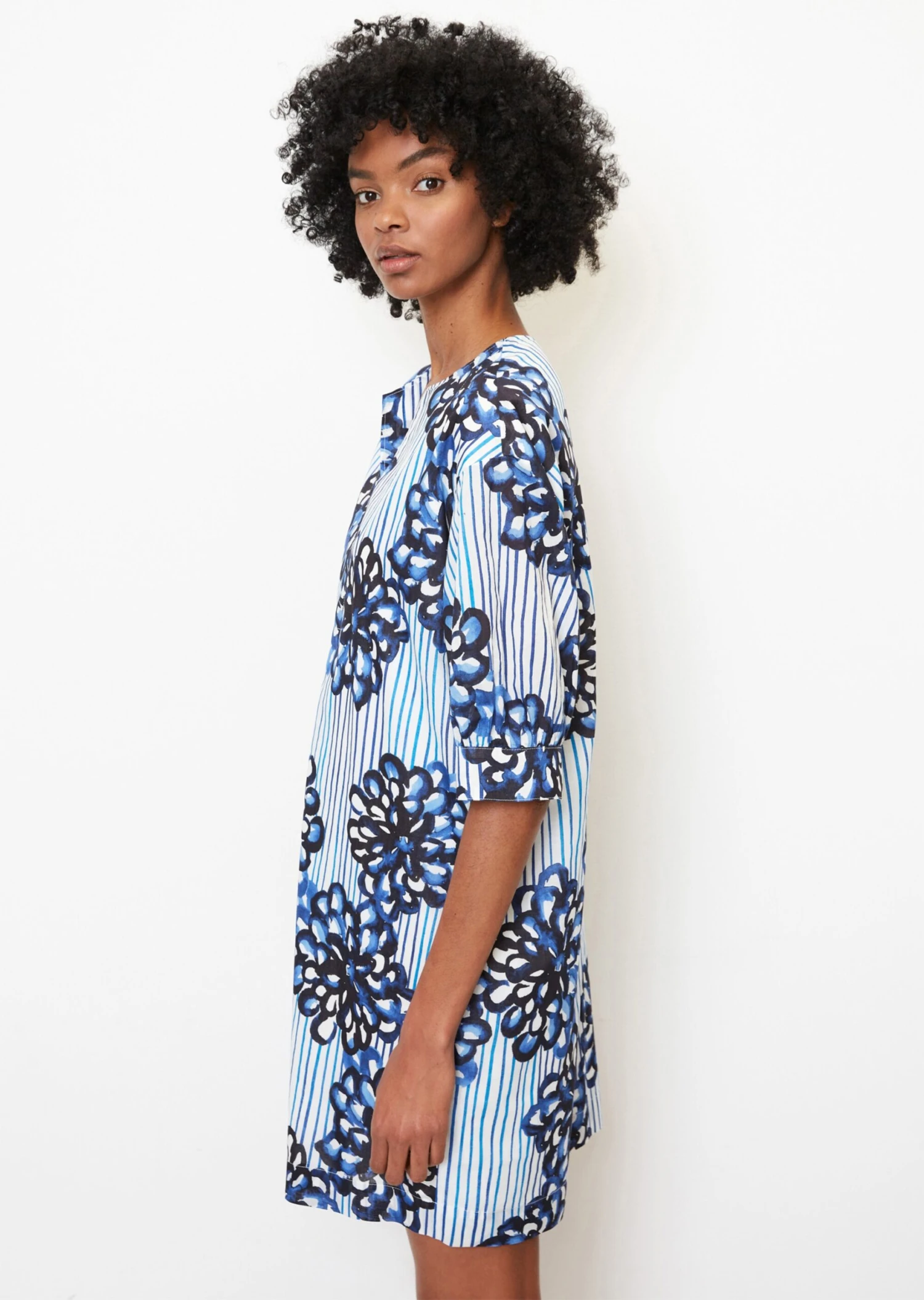 This light and breezy dress in pure cotton voile meets all the requirements of a beach dress. It is a feminine piece with a slit round neckline, slightly puffed short sleeves with cuffs and a slightly flared silhouette. The dress is fully lined with soft, flowing modal fabric, making it very comfortable to wear. Available in a variety of summery all-over prints.