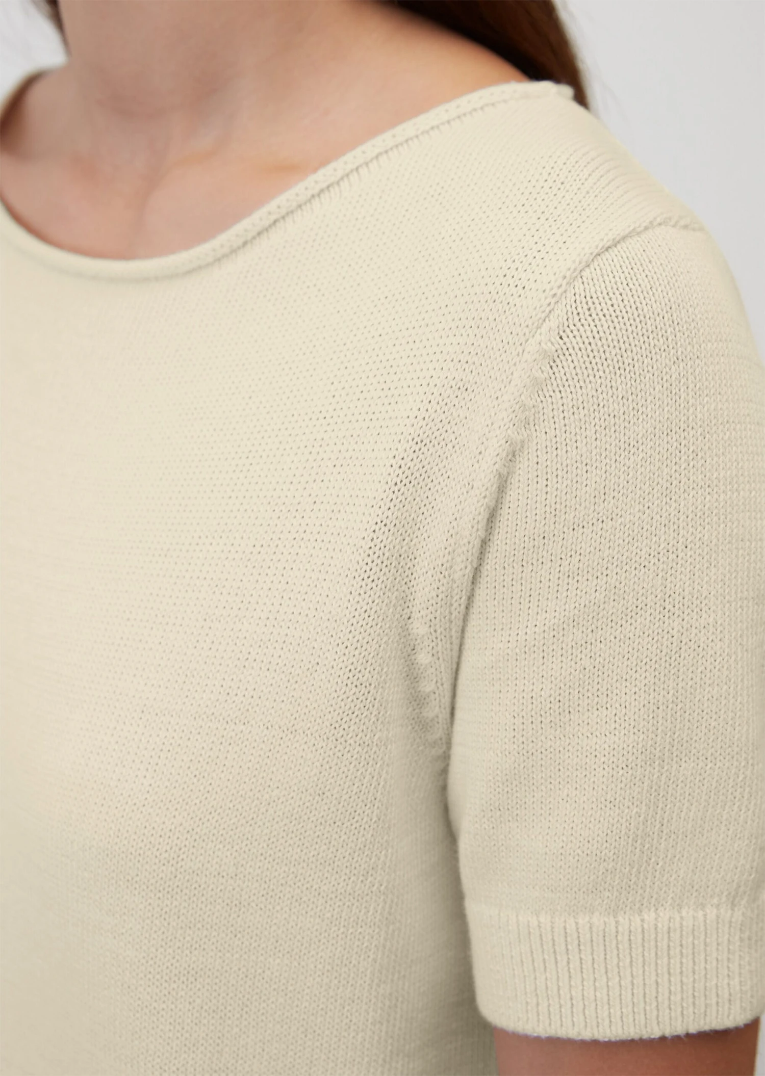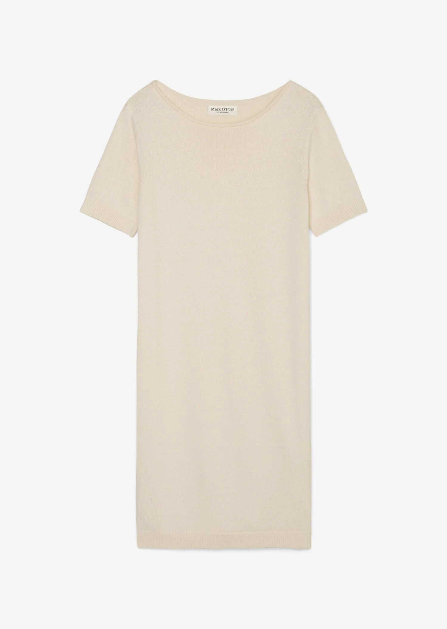 They always look sporty and elegant, are great as everyday wear and look fantastic on all age groups: knitted dresses! The fashion trend is easy to style and you only need a few additional accessories to create a more glamorous look. The knee-length design has a round neckline with a rolled edge, short sleeves with a rib knit edge and a hem with casual side slits. The yarn is a soft, elegant and high-quality blend of organic cotton, viscose and linen. Quality feature: the fully-fashioned, sustainable details at the arm openings are knitted to shape and do not involve any off-cuts, thus avoiding waste.