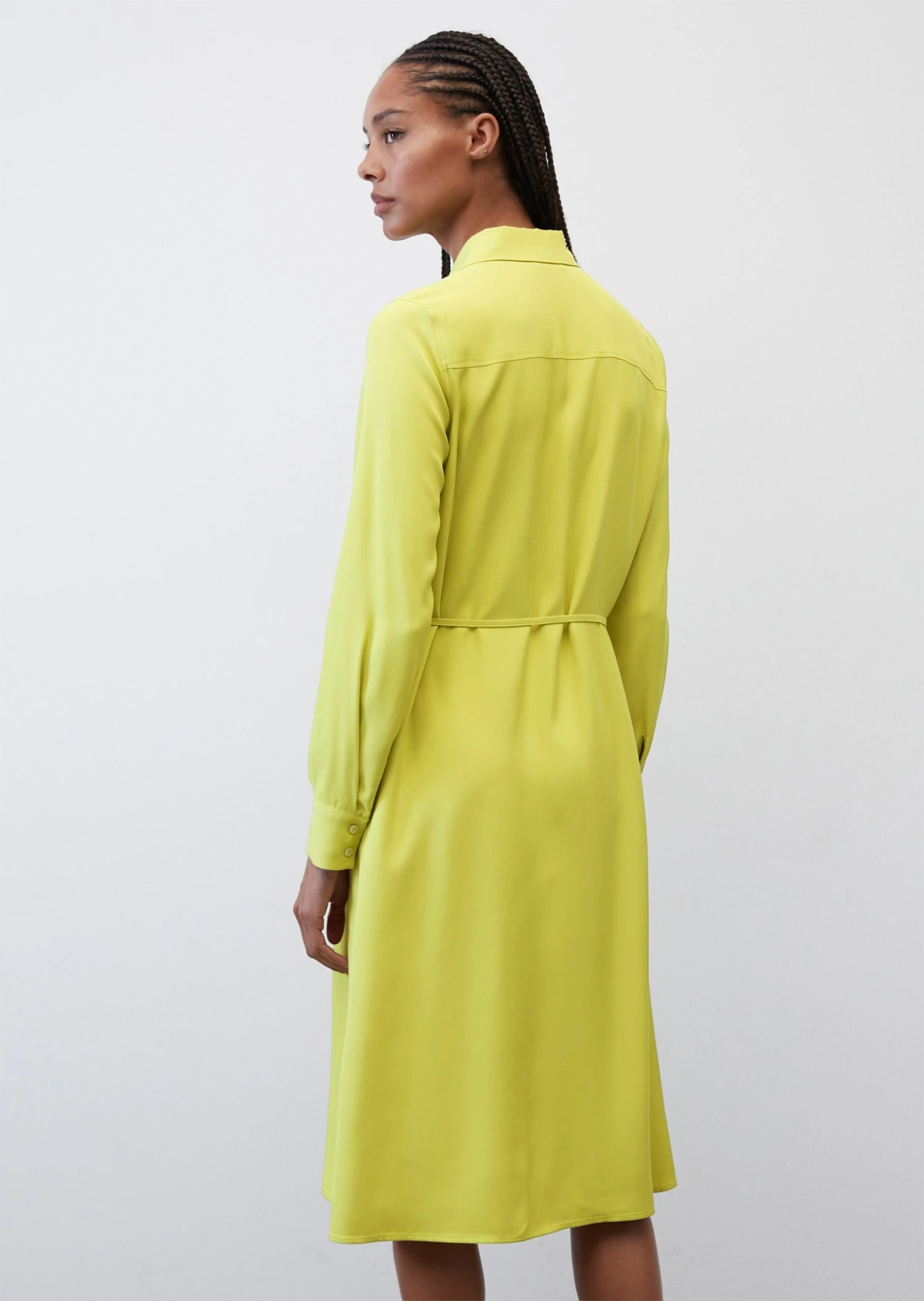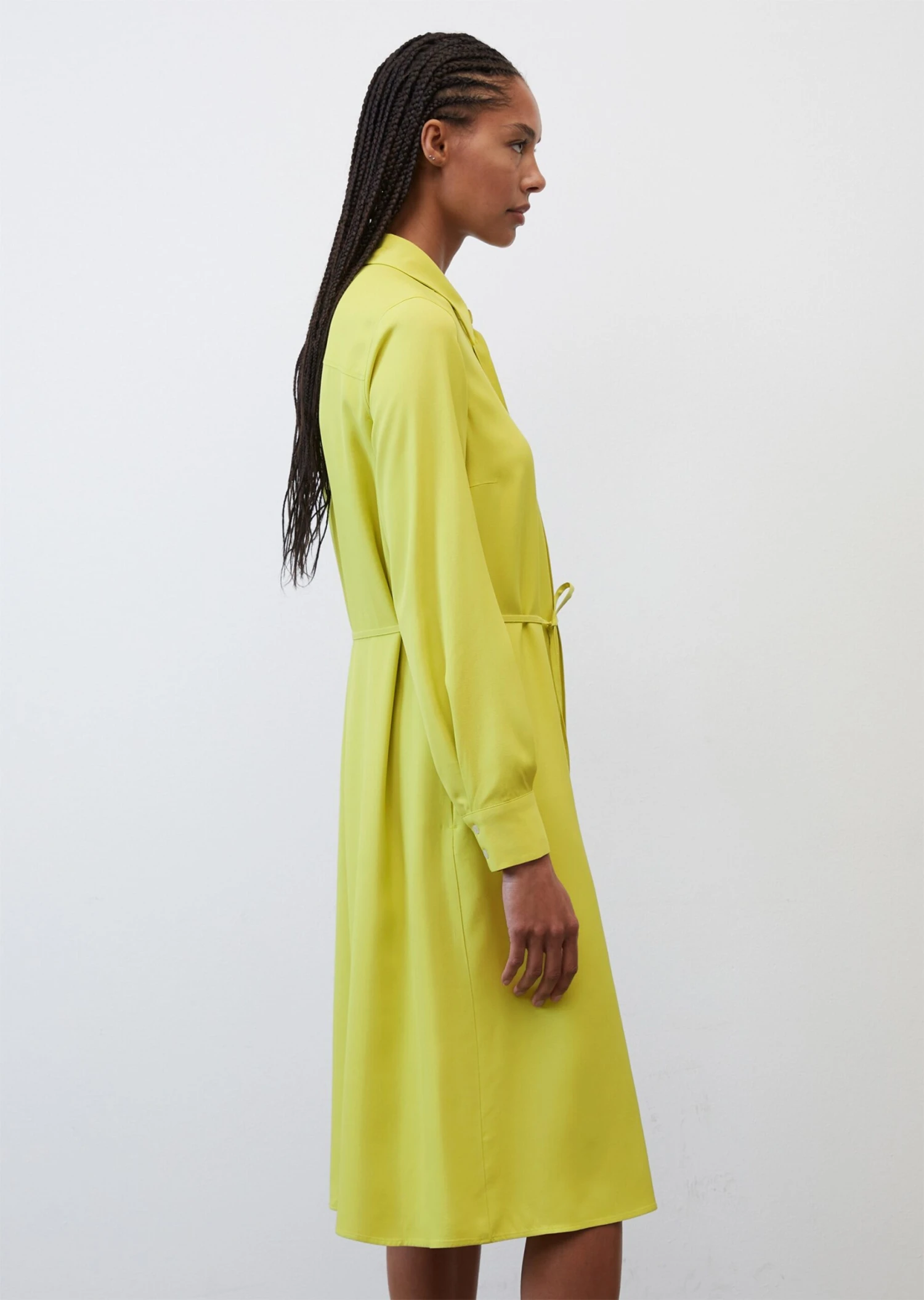 Timeless. Stylish. Elegant. Classic shirt dress with a modern touch. This dress is made of soft, flowing, high-quality viscose twill and comes in a moderate calf-length design. It has a Kent collar, shoulder yoke, long loose-fitting sleeves with wide cuffs and a detachable, narrow tie-around belt at the waist. The dress is buttoned all the way down the front and comes with in-seam slit pockets on the sides.