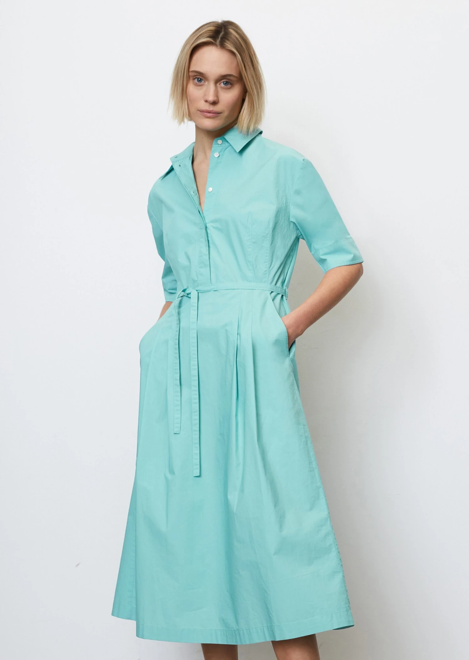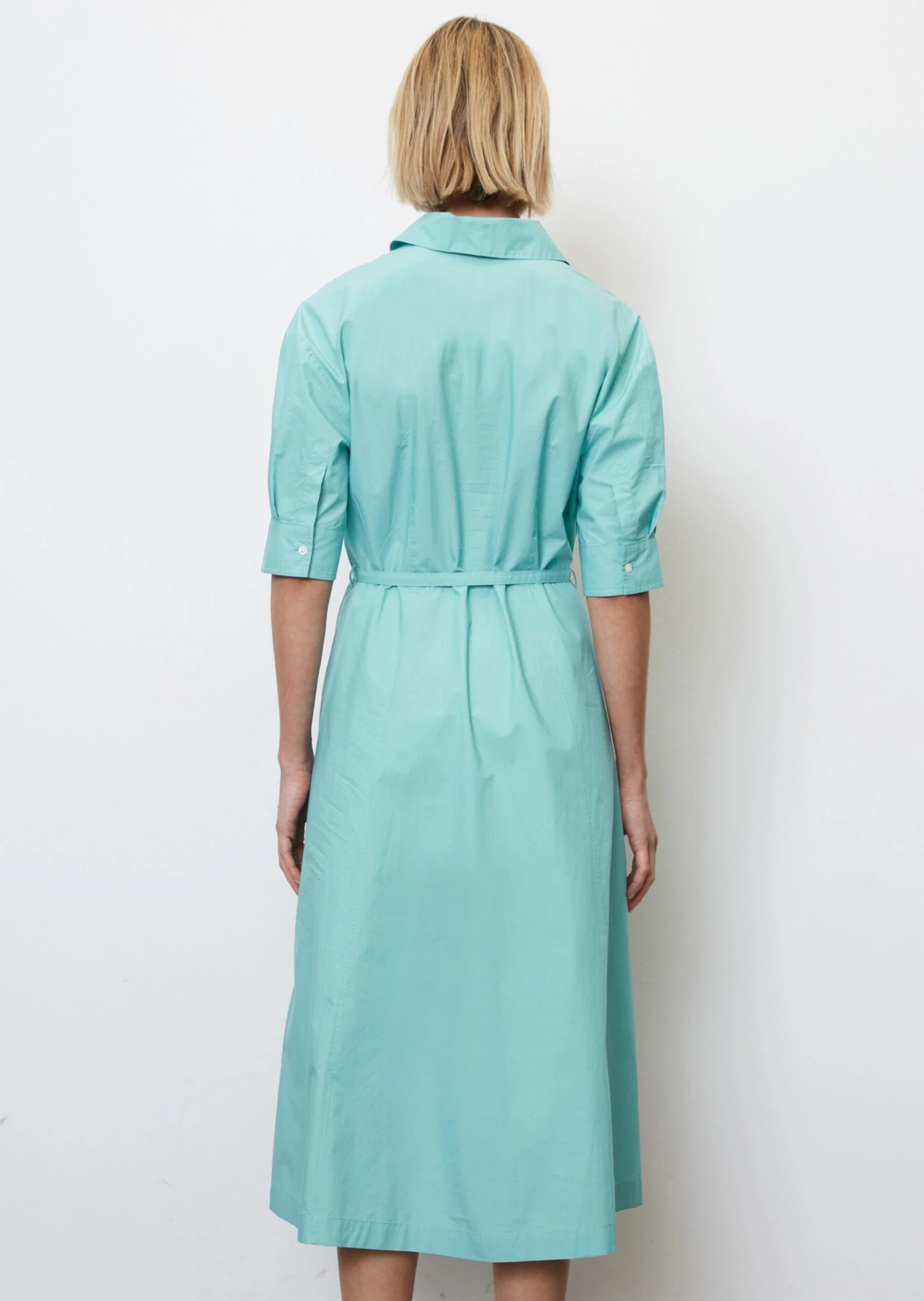 The shirt dress is one of our favourites for 2023. This ever-present fashion trend is a timeless piece with lots of class. This feminine piece is made of high-quality paper touch poplin fabric composed of pure organic cotton with a gentle rustling effect. The dress has a classic Kent collar, a mid-length, concealed button placket, mid-length puff sleeves with wide cuffs, a flared skirt with slanted slit pockets and a narrow, detachable waist belt. Latest, extremely trendy styling tip: pair it with socks and loafers.