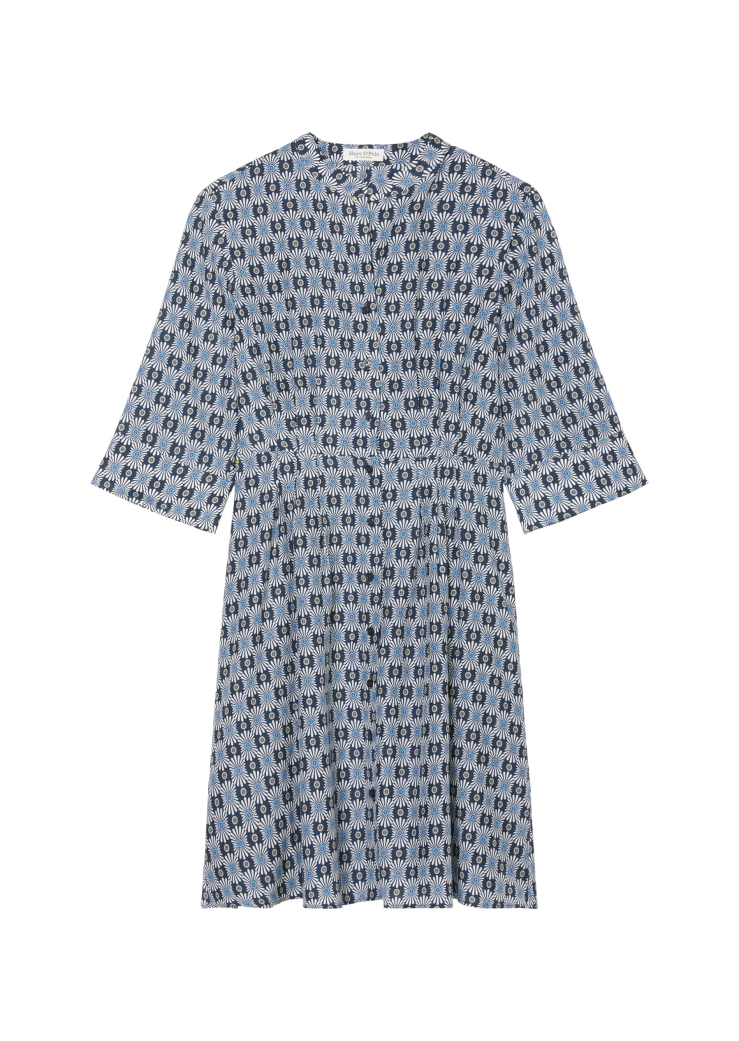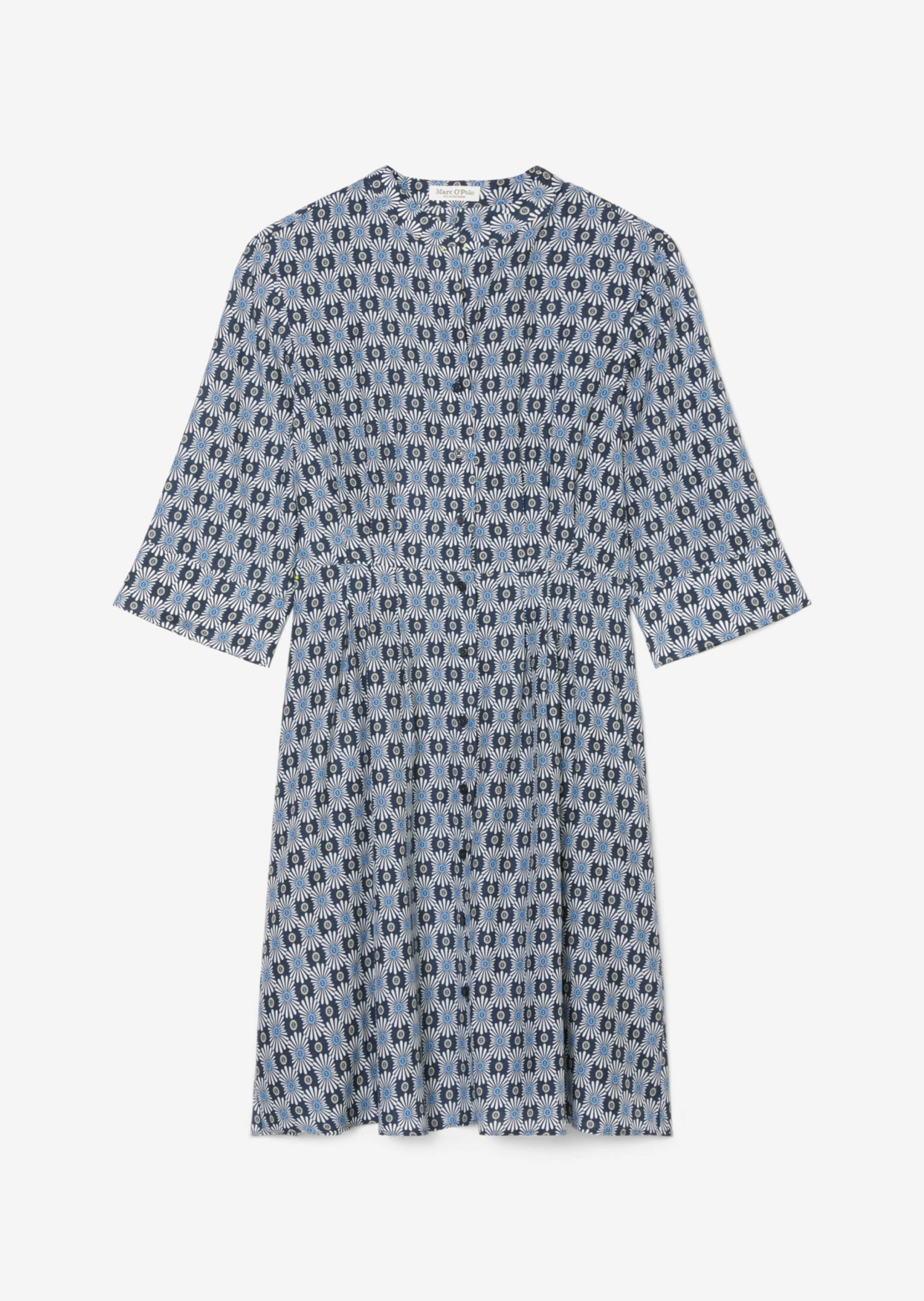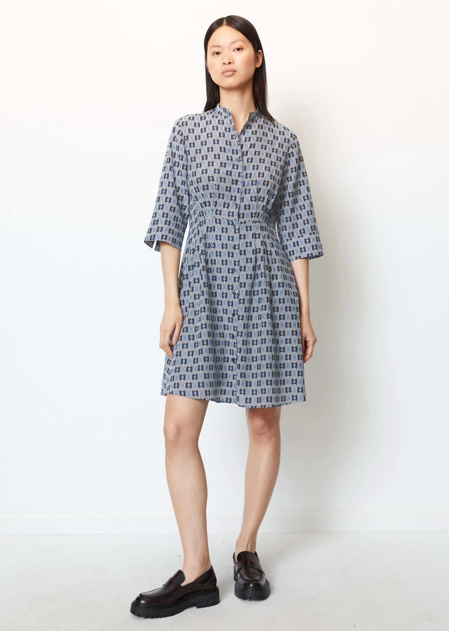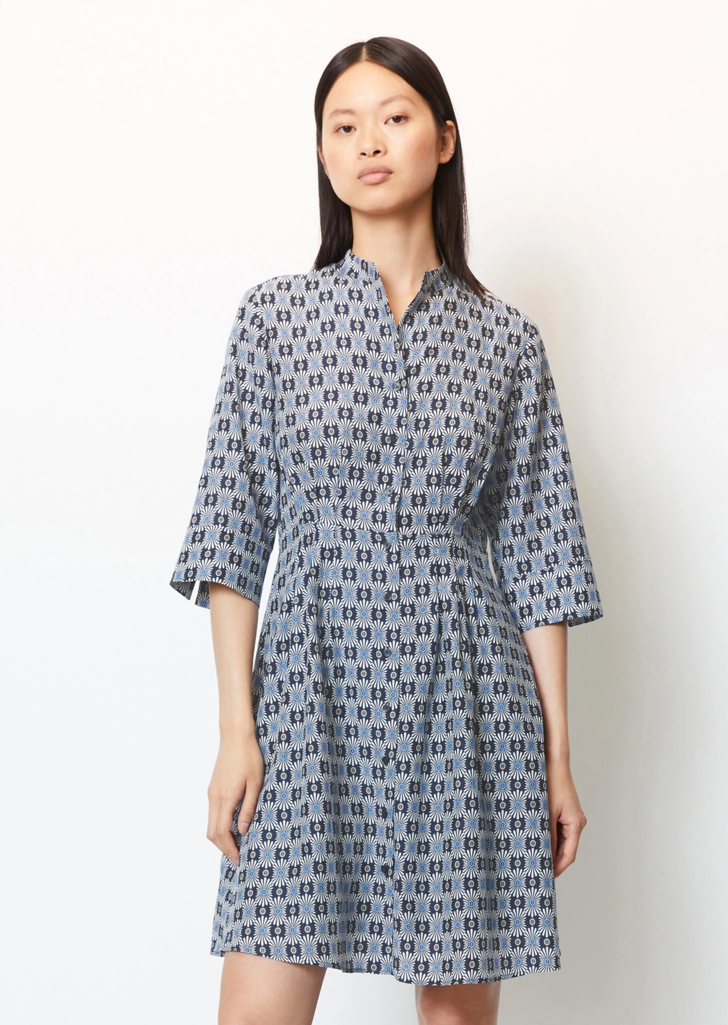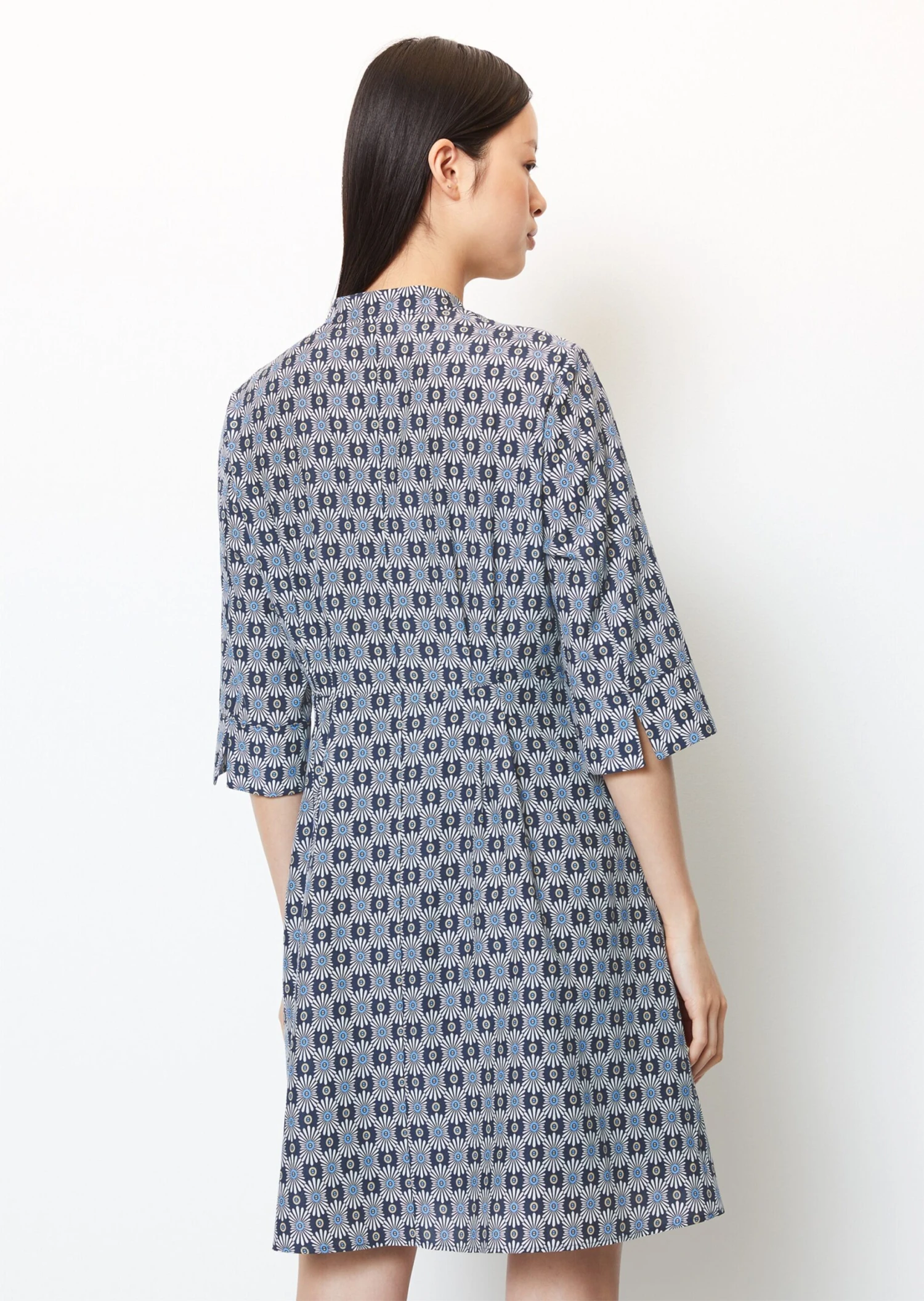 This casual, feminine blouse dress is a summer favourite and offers countless styling possibilities. It is made from a soft, printed organic cotton/viscose blend with a silky texture. It comes in a regular fit with a high stand-up collar, full-length button placket, 3/4-length blouse sleeves with vented cuffs and a short, pleated skirt section. The dress hugs the waist, while the upper section and skirt are loose fitting. This breezy dress is lined from the waist down and is perfect for a sporty business look.