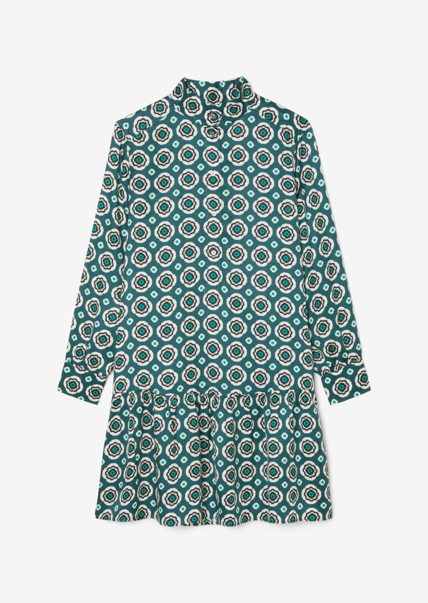 Dress trend: the knee-length, loosely cut dress in shirt style convinces with an ingenious combination of cut and pattern. The casual all-rounder features subtle variations, making it look even more casual and modern. It has a high stand-up collar, a half button placket, a shoulder yoke and a low-set, heavily gathered skirt. The long puff sleeves with the wide cuff end provide an eye-catcher. The dress is not lined and is made of luxuriously flowing viscose twill.