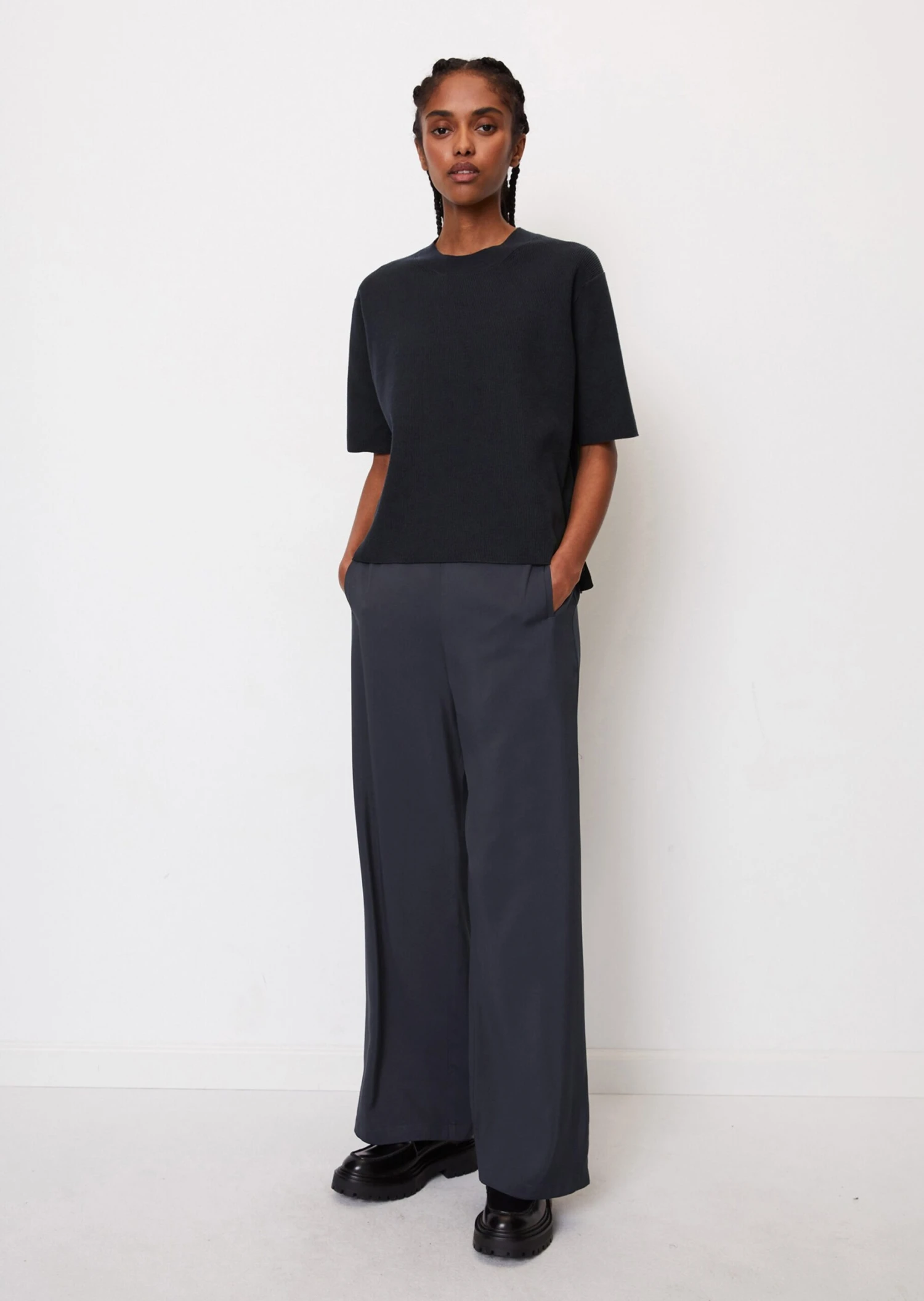 Modern basic piece for a sensual, androgynous look: this short-sleeved jumper in a clean design is modelled on the masculine classic. Reworked in a feminine fit, with a skinny rib round neckline, high-quality fully fashioned details and side hem slits. The fabric: high-quality, elegant fine knit yarn made of pure organic cotton linen with a ribbed, very soft surface. Styling tip: paired with a colour-coordinated cardigan, it has the look of a casual twinset.