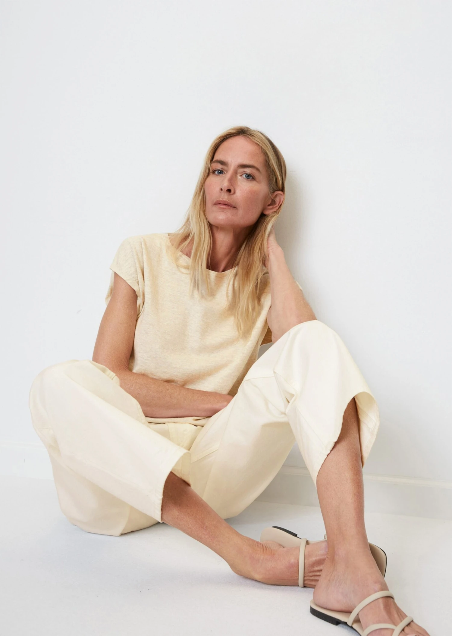 A summery trend piece thanks to the cool, sleeveless design: minimalist jumper in a loose, boxy cut. The piece is made of high-quality blended organic cotton and linen and comes with the fine slub texture typical of the fabric. With a finely ribbed round neckline, dropped shoulders and casual side hem slits.