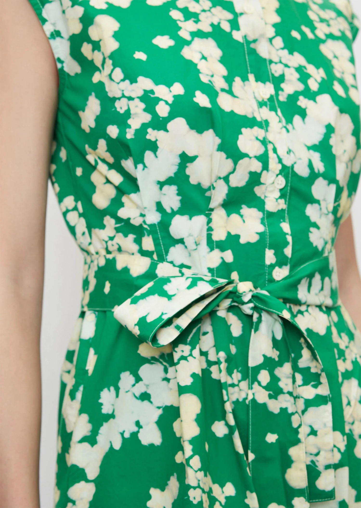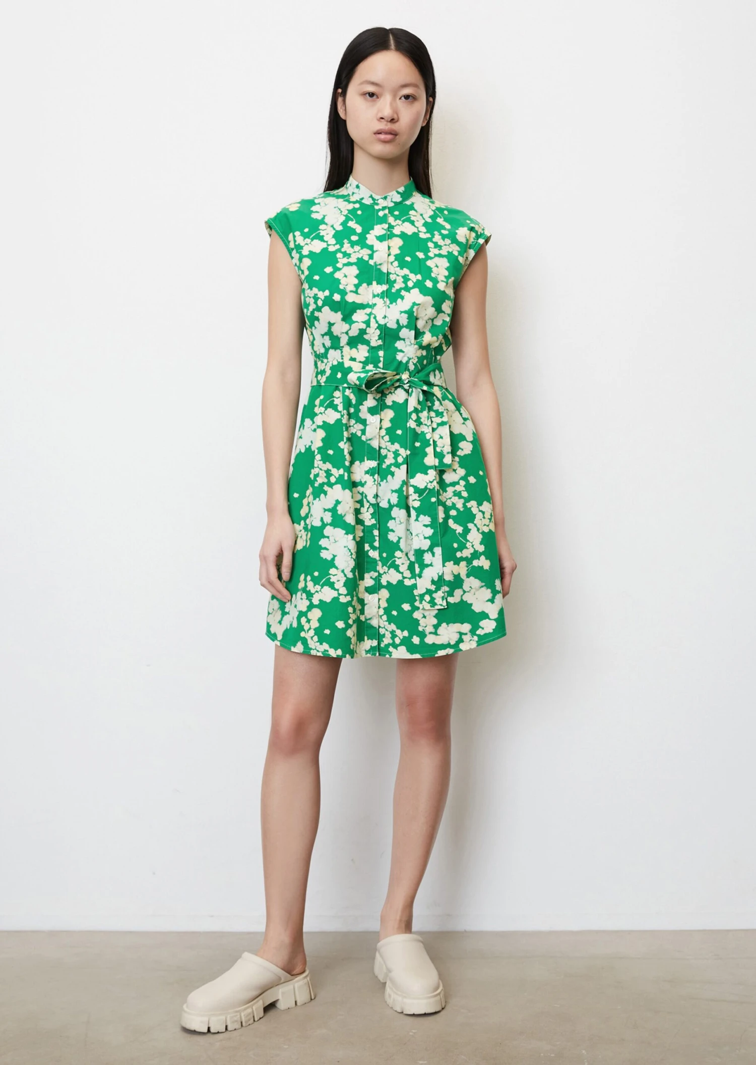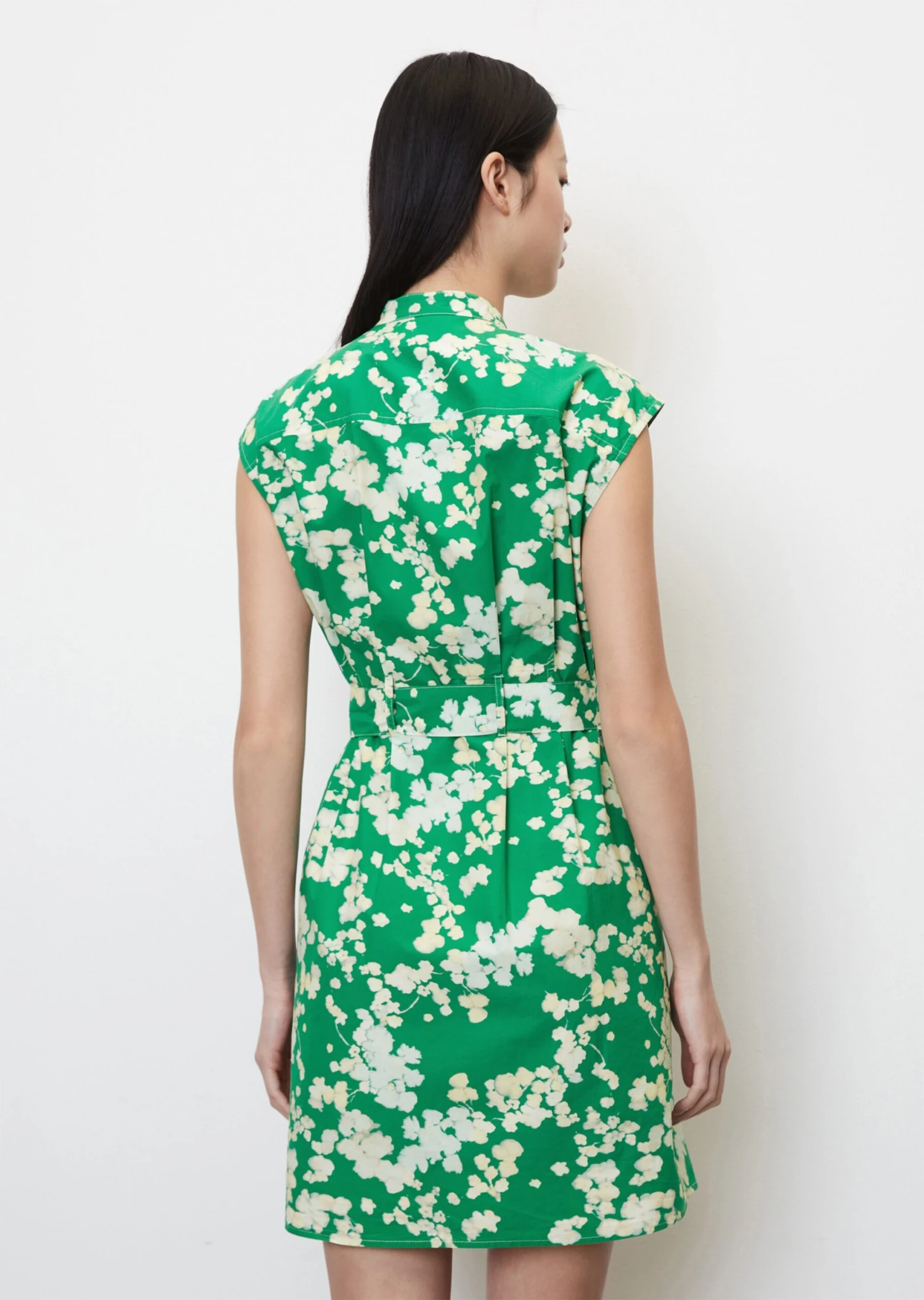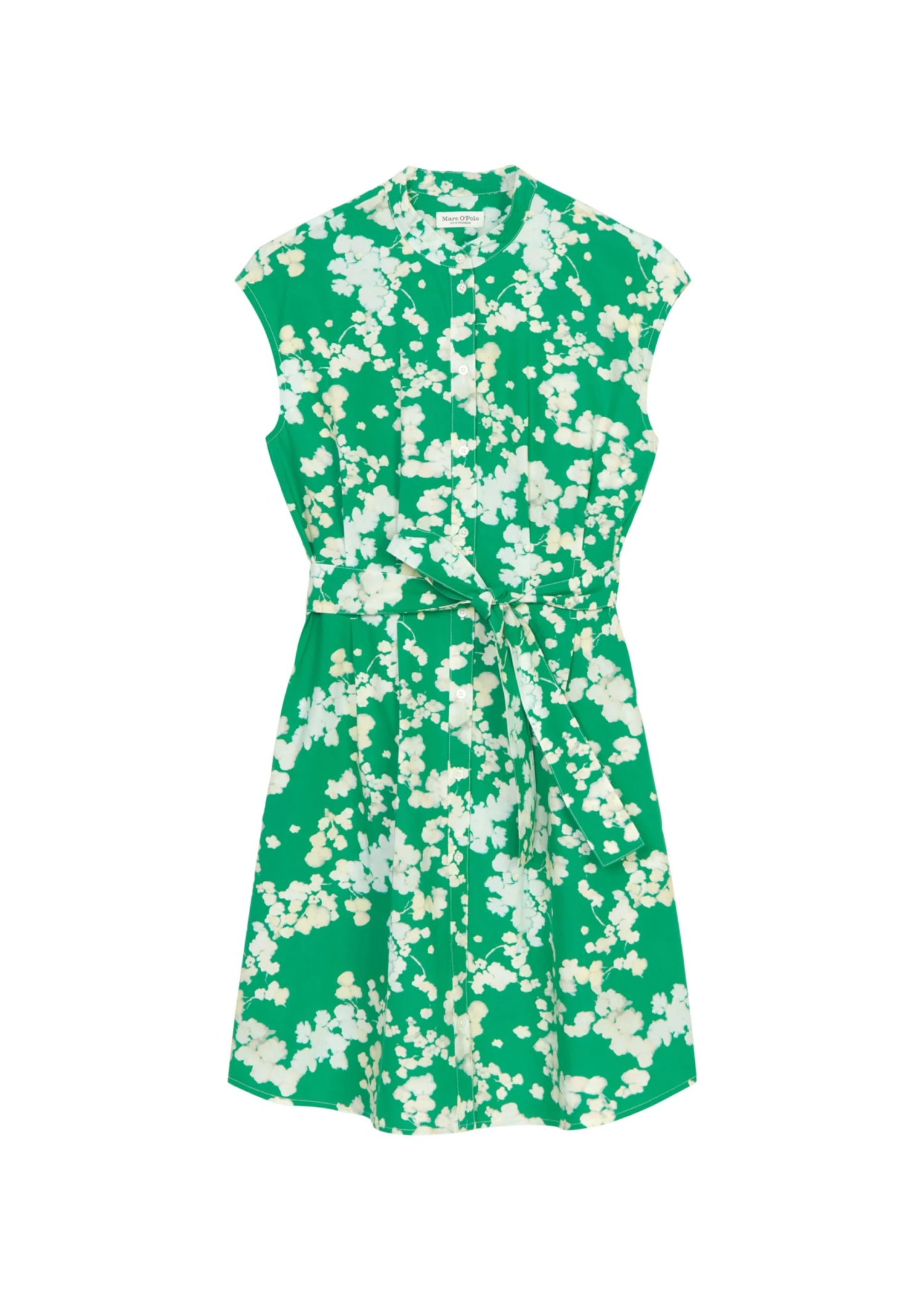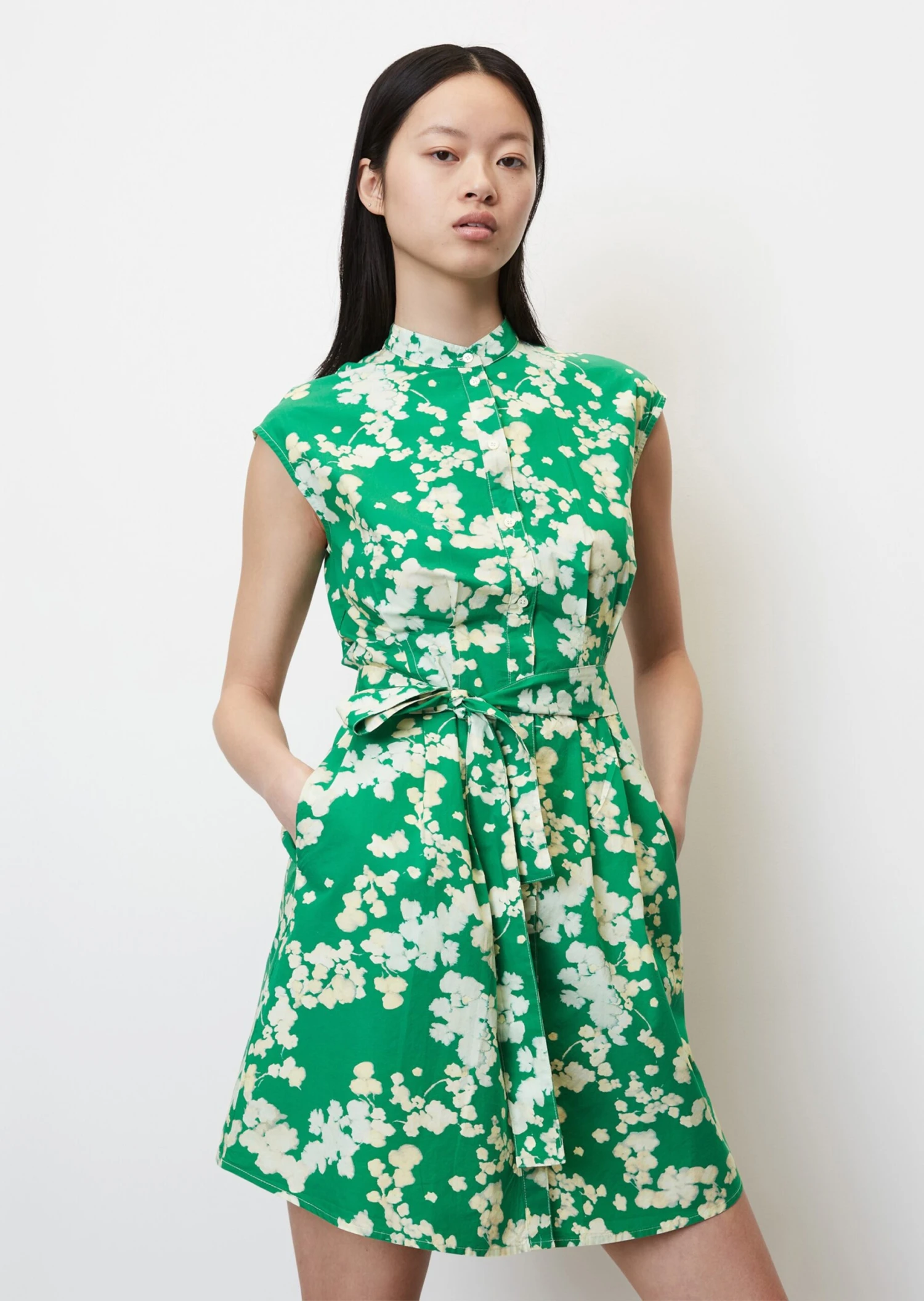 The clear focus of this piece is the waist – the short, stylish summer dress with no sleeves is made of high-quality cotton poplin and has elaborate dart details at waist height, which are accentuated further by a detachable belt. The dress comes in a casual shirt blouse style and features a stand-up collar, a full-length button placket, practical side slit pockets and a beautifully rounded hemline. The short dress is not lined.