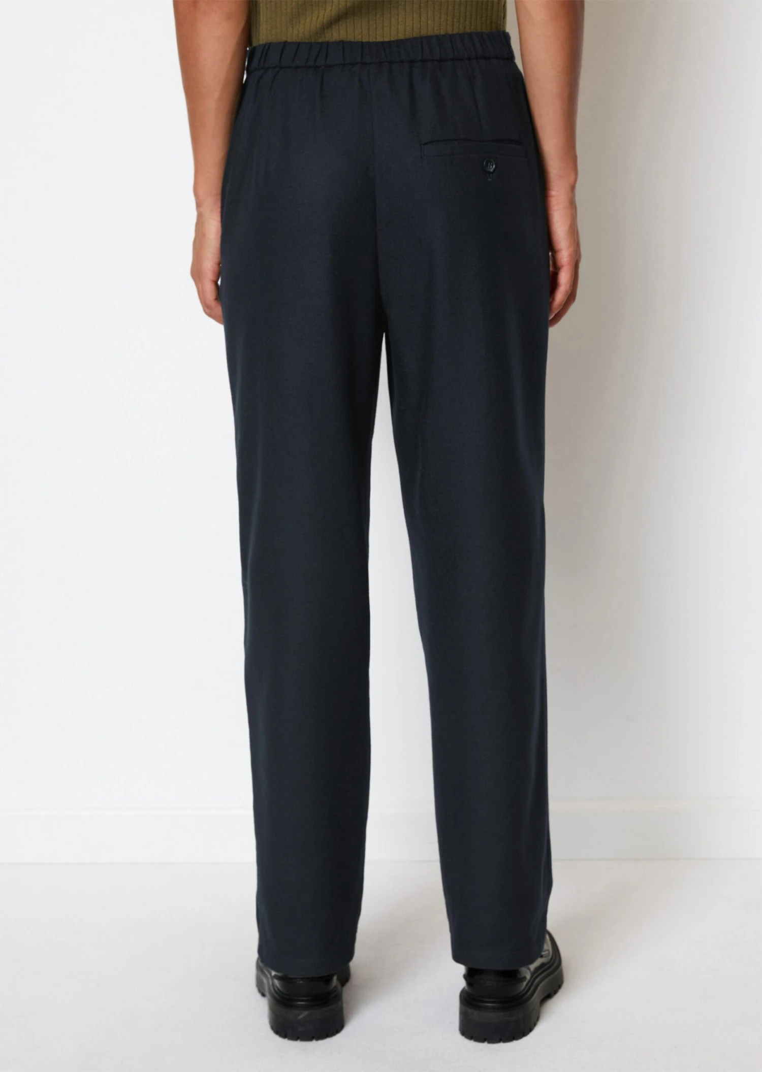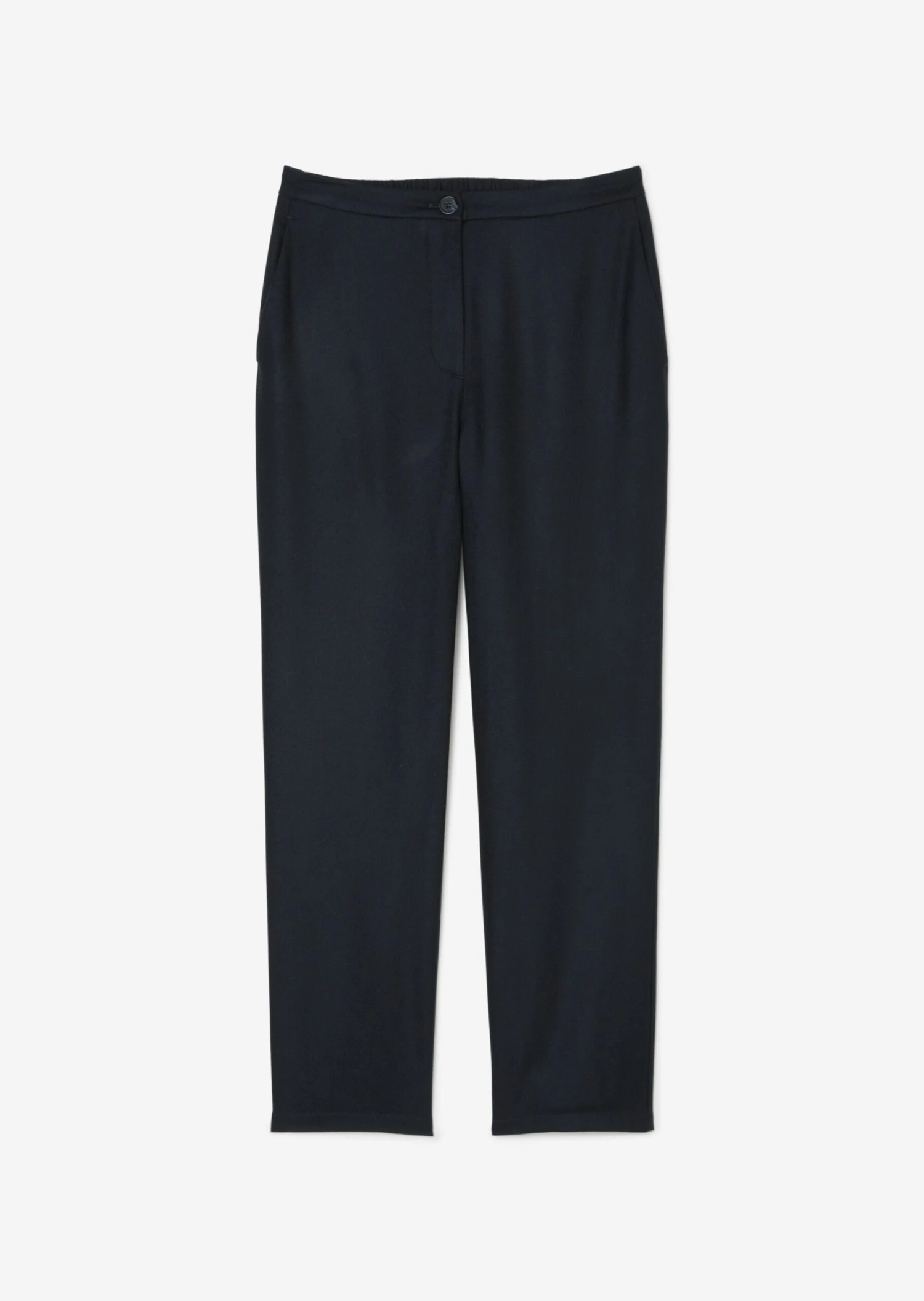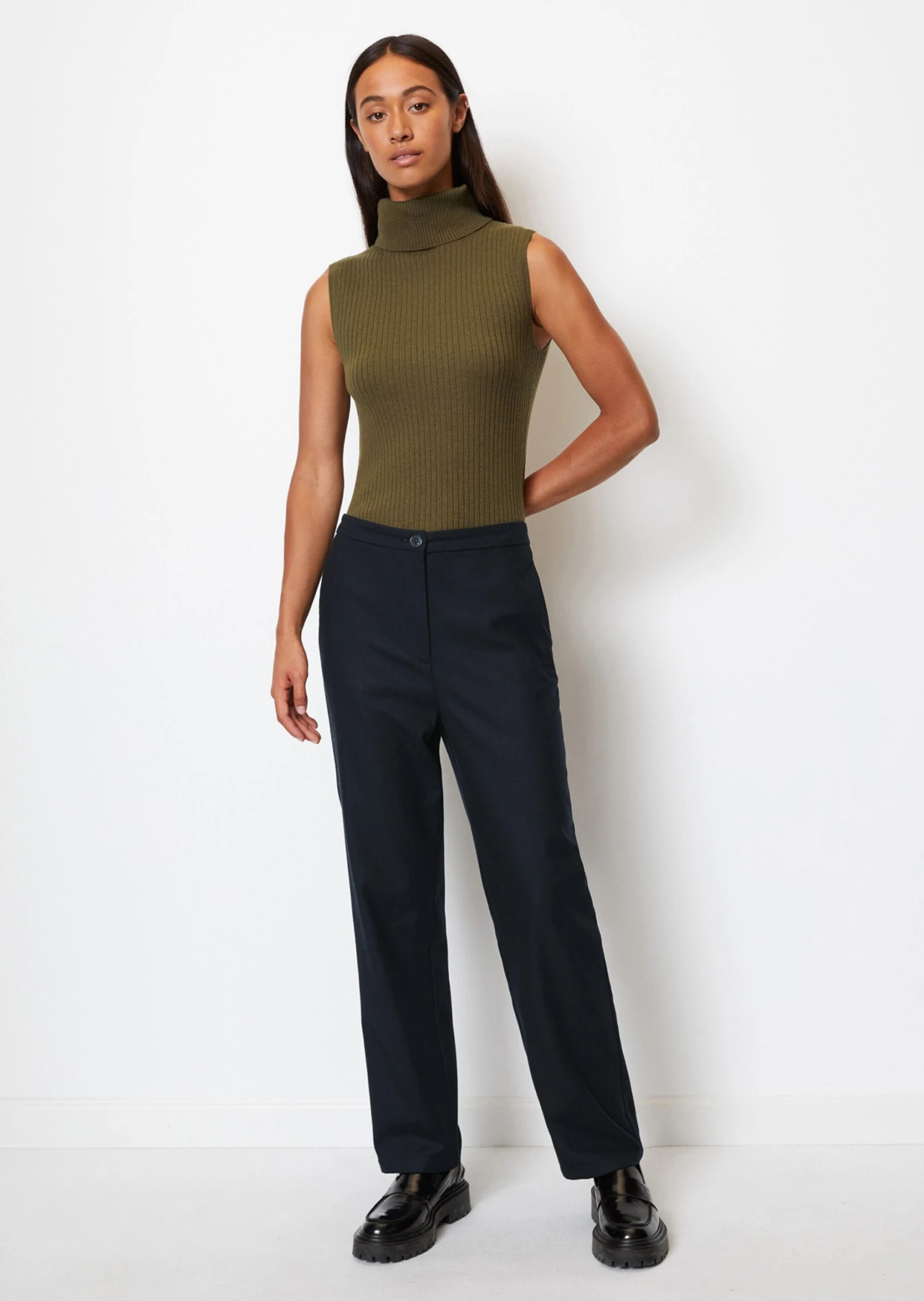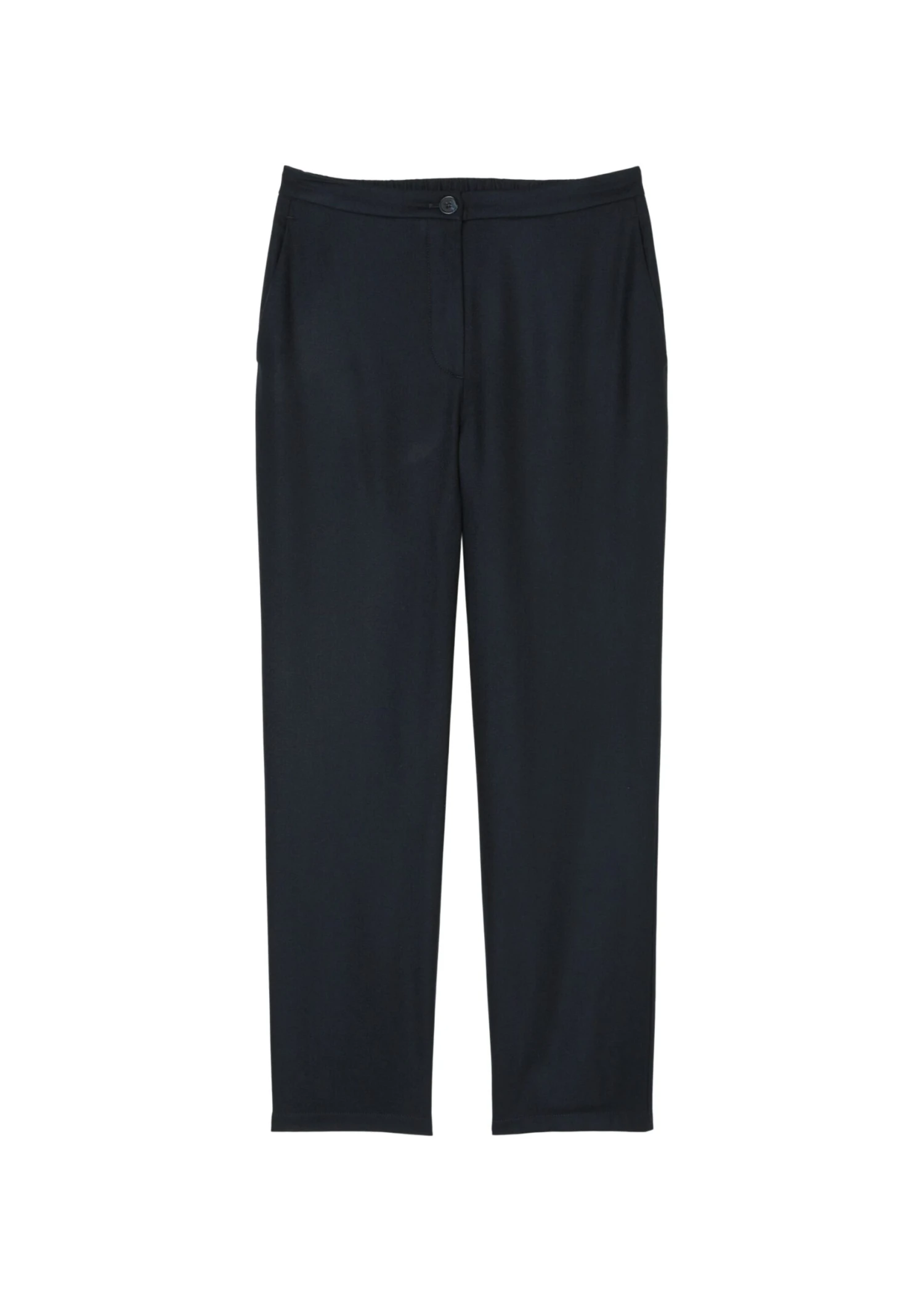 Chic and comfortable? Menswear-inspired pants have turned out to be a real classic. They have a relaxed, straight fit with a regular waist and a shortened leg length. The ankle-length style is crafted from an exclusive Italian virgin wool-blend quality by Manteco and comes with a semi-elastic waistband, slanted welt pockets and a buttoned welt pocket on the back. Elegant and feminine, this timeless piece is incredibly versatile. Super casual with sweatshirt or hoodie and cool with blouse and blazer.