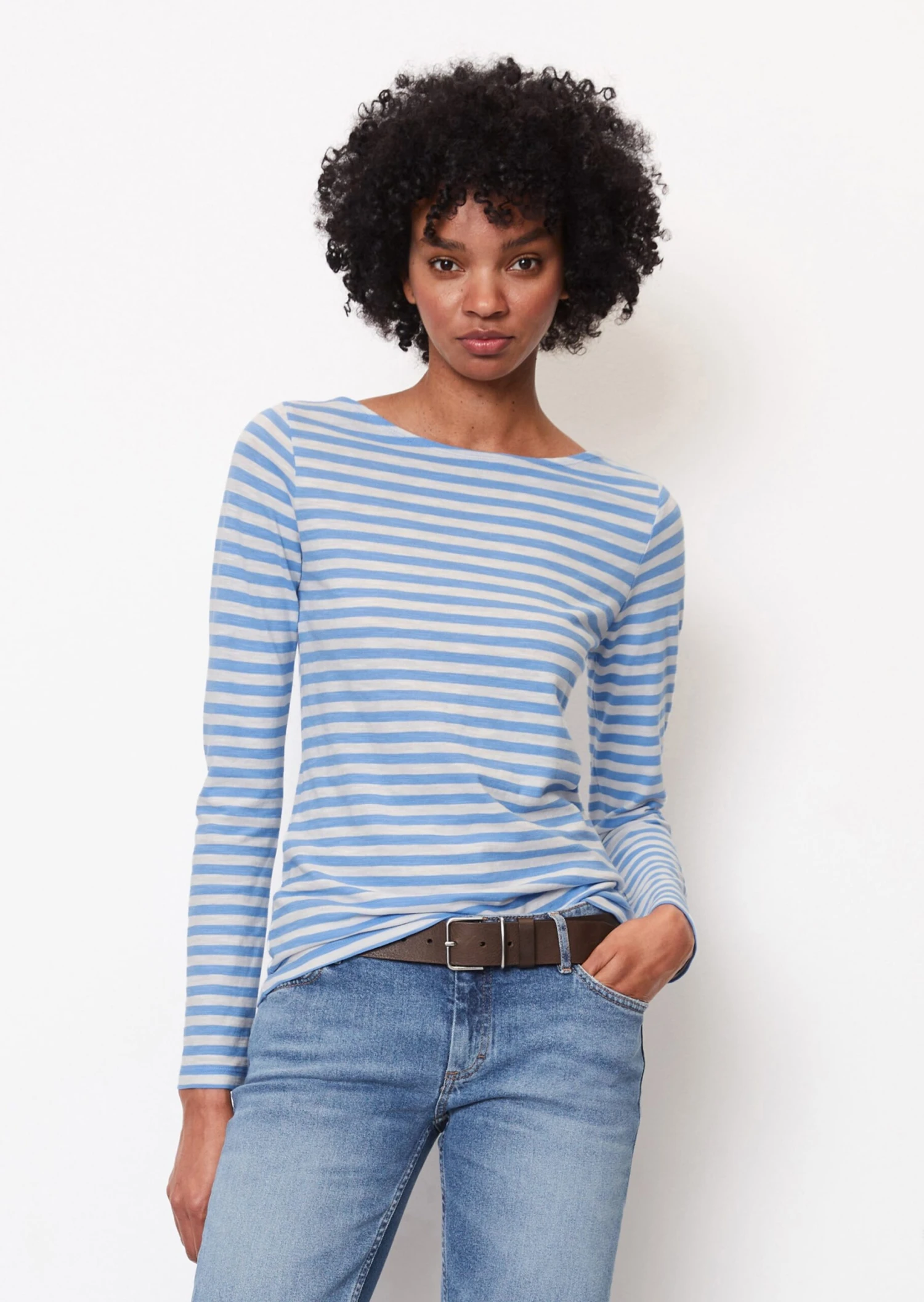 In the style of a French trend piece: super casual striped long sleeve top made of soft, pure organic cotton jersey fabric. Featuring a bateau neckline and a small logo print on the hem. The texture: soft, loose and grainy all at the same time. This high-quality garment made of organically cultivated cotton is an expression of our commitment to the environment.
