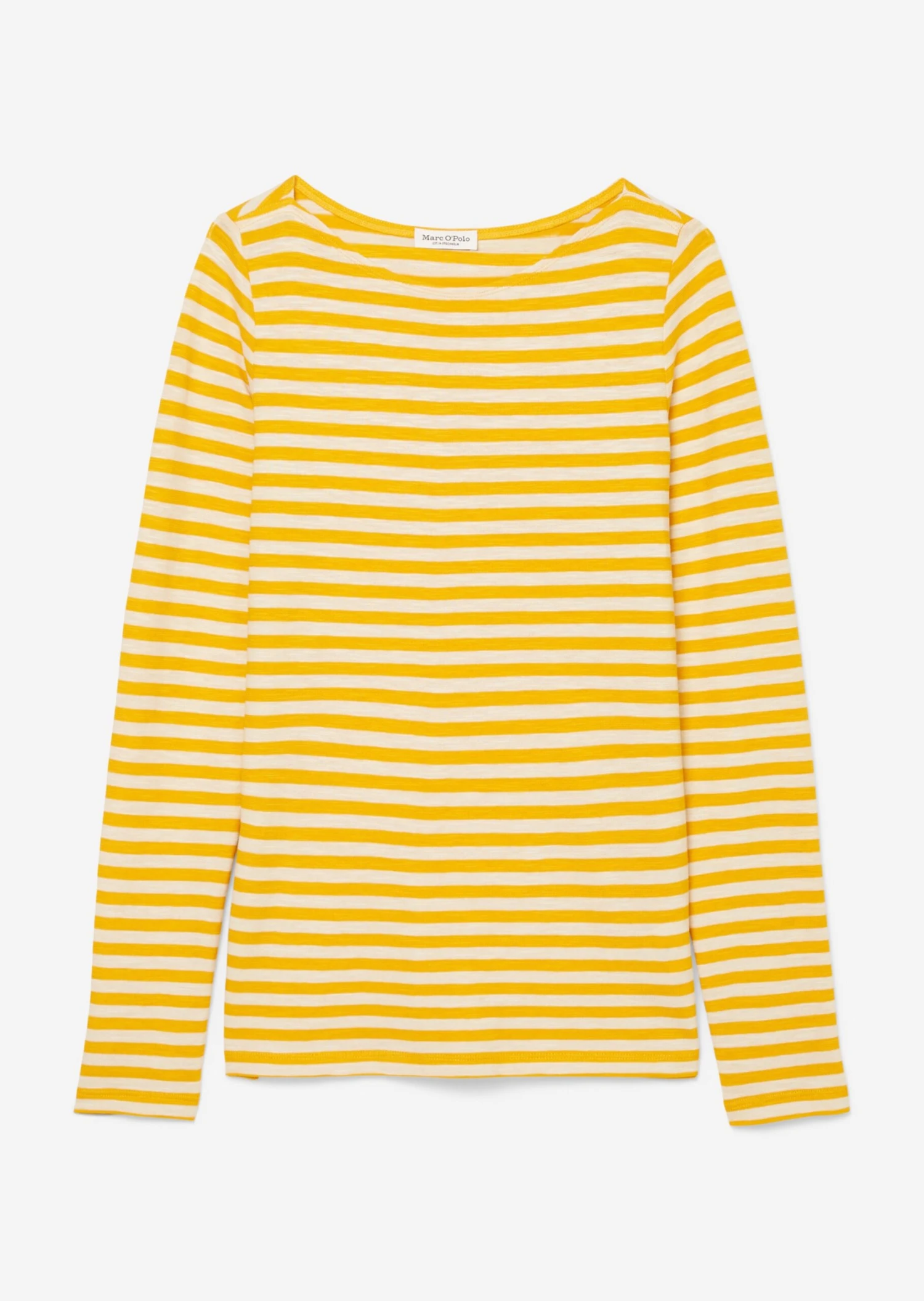 In the style of a French It piece: super cool striped long-sleeved top made of soft, pure organic cotton slub jersey fabric. Featuring a bateau neckline and a subtle logo print on the hem. The texture is soft, loose and grainy all at the same time. The fit: regular, feminine, comfortable. This high-quality, sustainable garment made of organically cultivated cotton is an expression of our commitment to the environment. Styling tip for quintessential French chic: pair with mom jeans, flat ballerinas and a quilted jacket or trench coat.