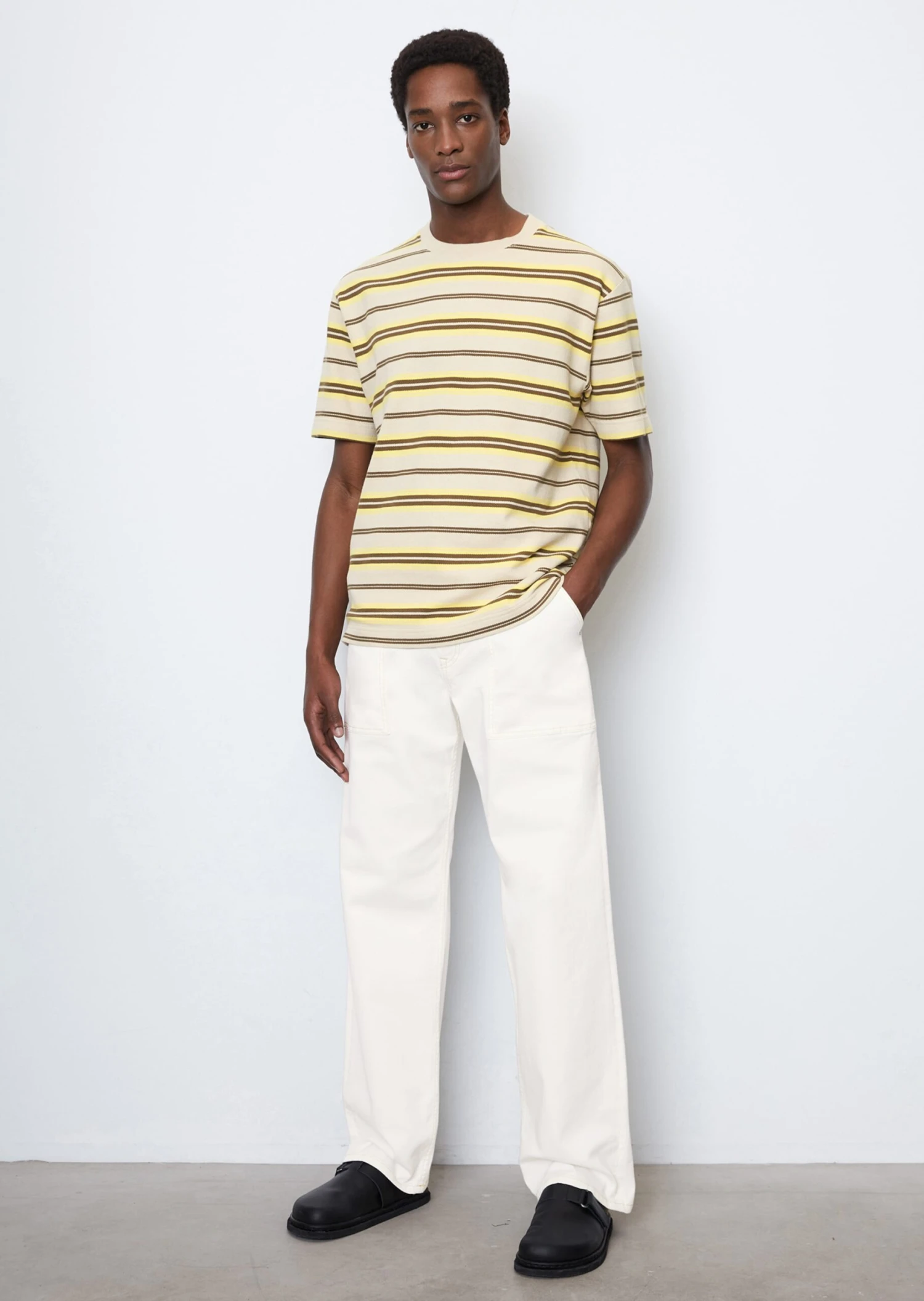 With a fine, horizontal herringbone texture and yarn-dyed striped pattern: the casual T-shirt in a loose relaxed fit with a ribbed round neckline, short sleeves and straight hemline impresses with its relaxed design. It guarantees a high level of comfort with its high-quality, soft, heavy fabric composed of GOTS-certified organic cotton.