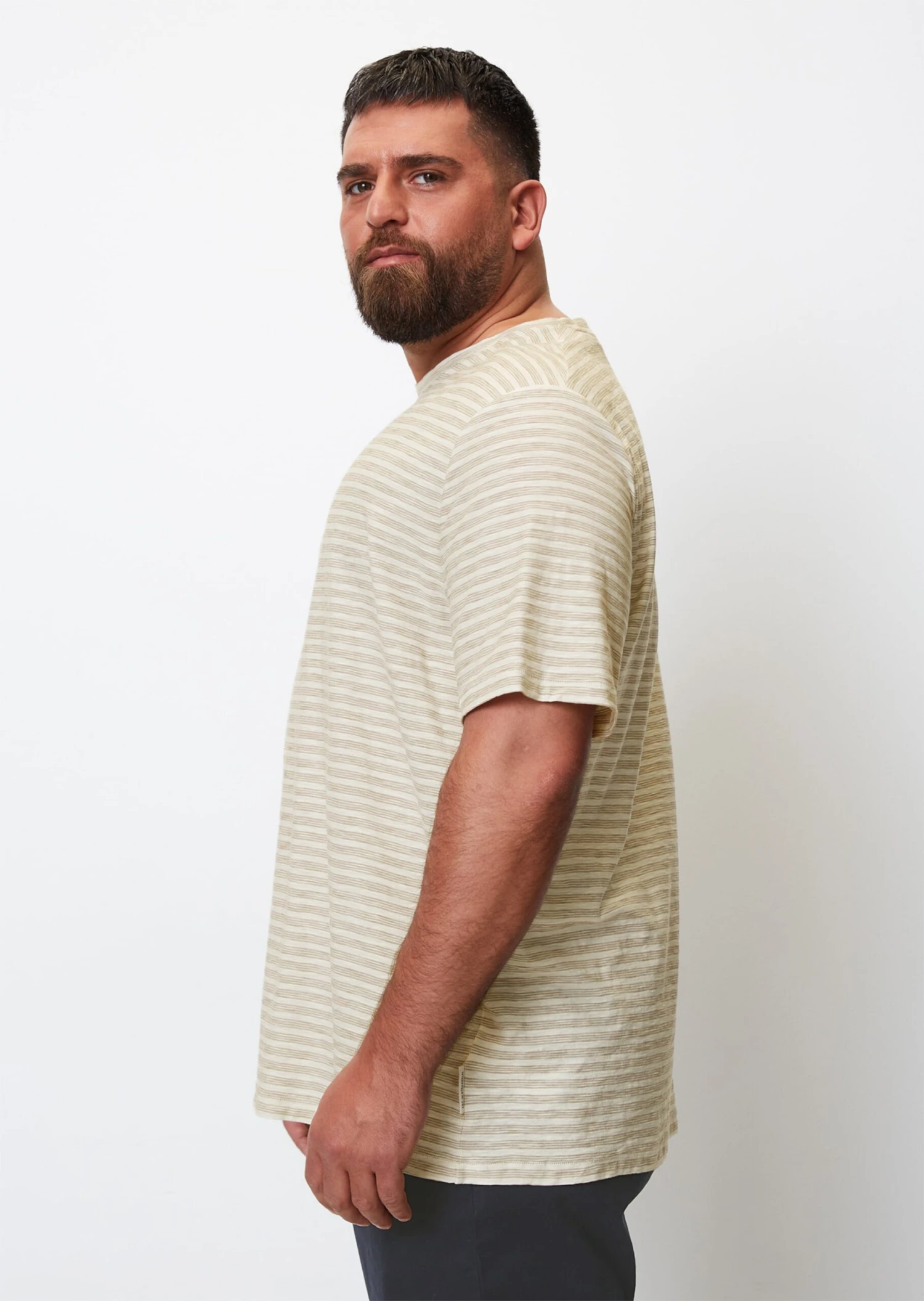 Inside-out to the casual used look: the high-quality T-shirt made of soft, GOTS-certified organic cotton in easy-care slub jersey quality ensures a comfortable feel. The fact that the back of the yarn-dyed, multicolored stripe pattern is on the outside adds an extra dose of casualness. In masculine regular fit with round neck, short sleeves and straight hem line.