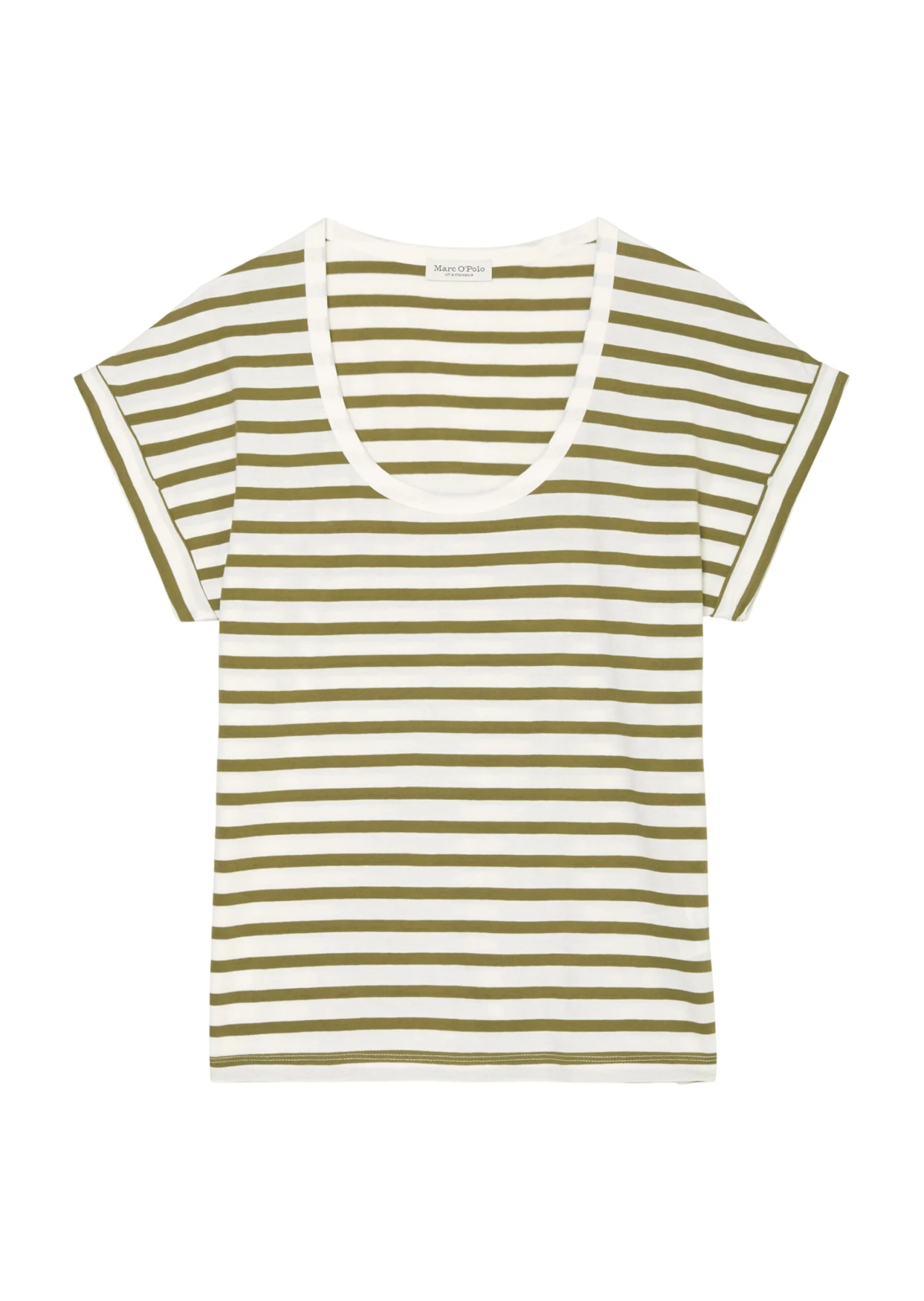 Modern, minimalist and striped. Fresh design for a basic T-shirt. This casual piece is made of fine, lightweight and yarn-dyed single jersey and features a deep round neckline. It is soft against the skin and comes in a regular fit with cut-on sleeves finished with fixed turn-up sleeve hems and a straight hemline.