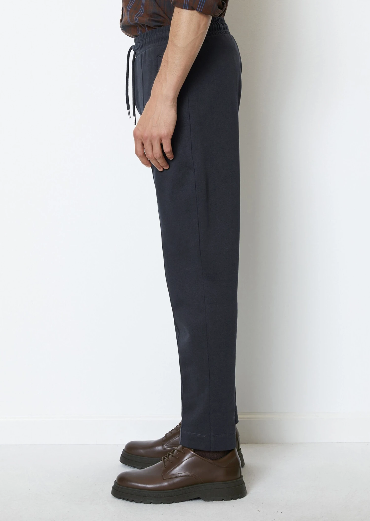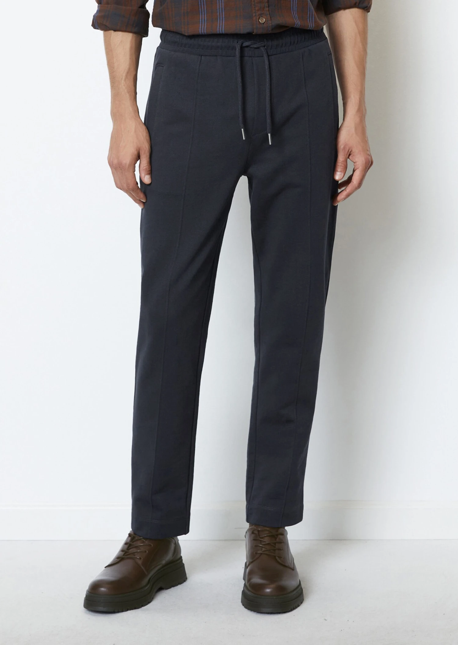 Catapulted from the sports field to the catwalk and has become a popular everyday companion: the jog pants! Here it shows a smart upgrade and offers a raised front seam in crease style. Model made of pure, GOTS-certified organic cotton with softly brushed inside. The waistband is comfortably elastic and can be adjusted in width by a drawstring and a cord with shiny metal ends, making a belt unnecessary. There are narrow side pockets and a patch pocket on the back.