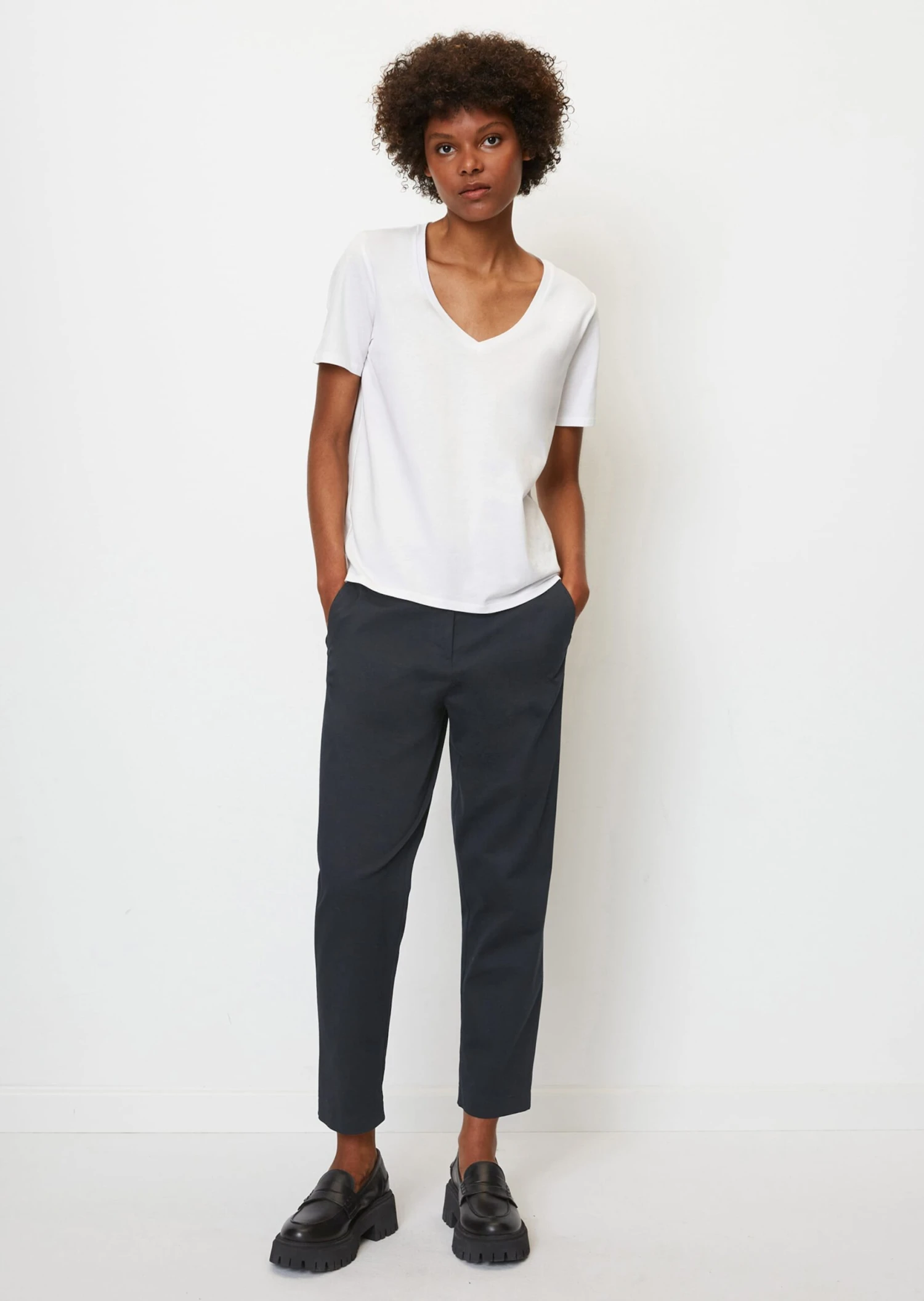 Clean, Scandi, with feminine charm and the perfect combination of cool and chic: casual T-shirt made of pure GOTS-certified organic cotton fabric. Loose, regular fit with a deep V-neck, short sleeves and a classic hemline. Modern design with a high style factor.