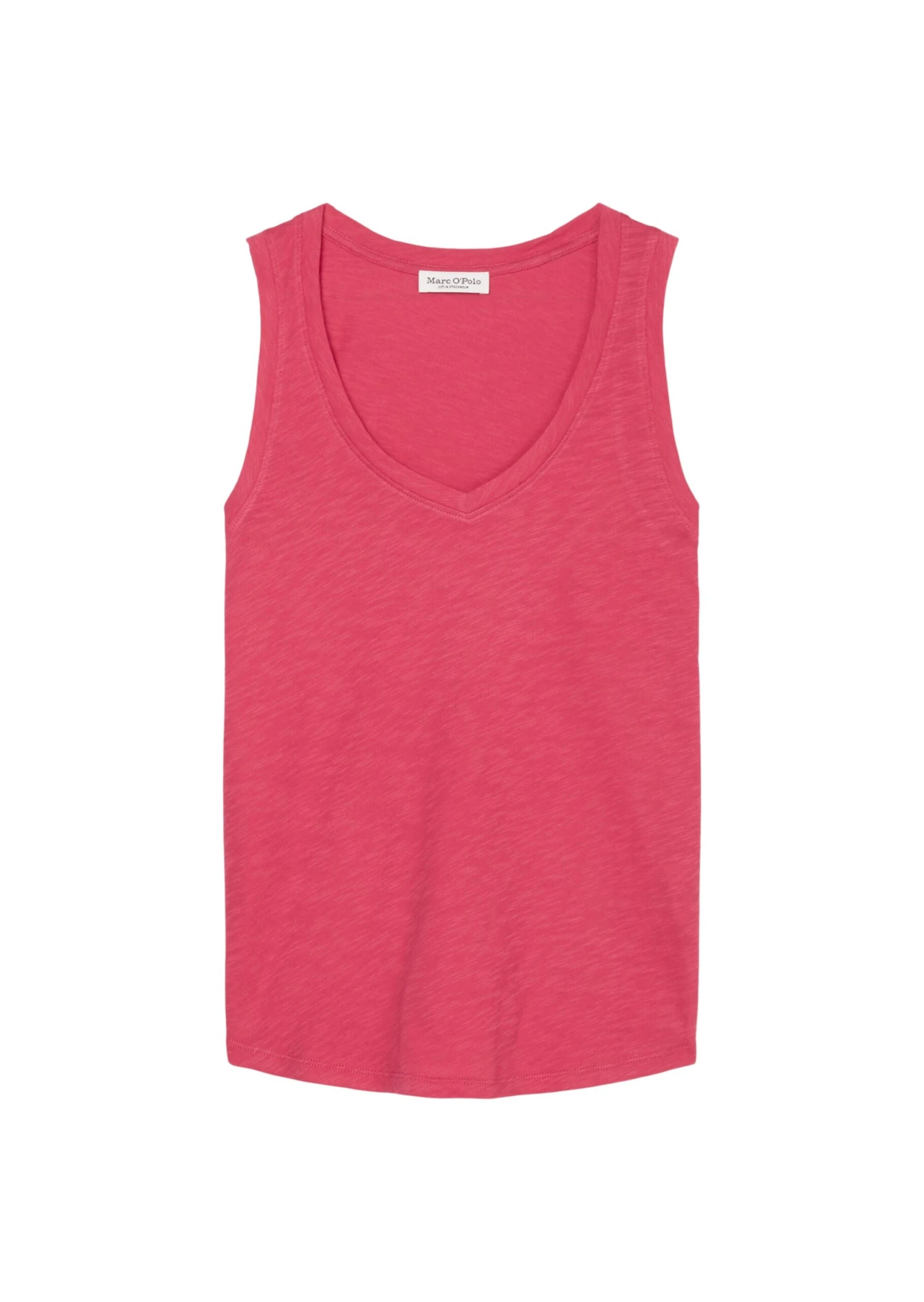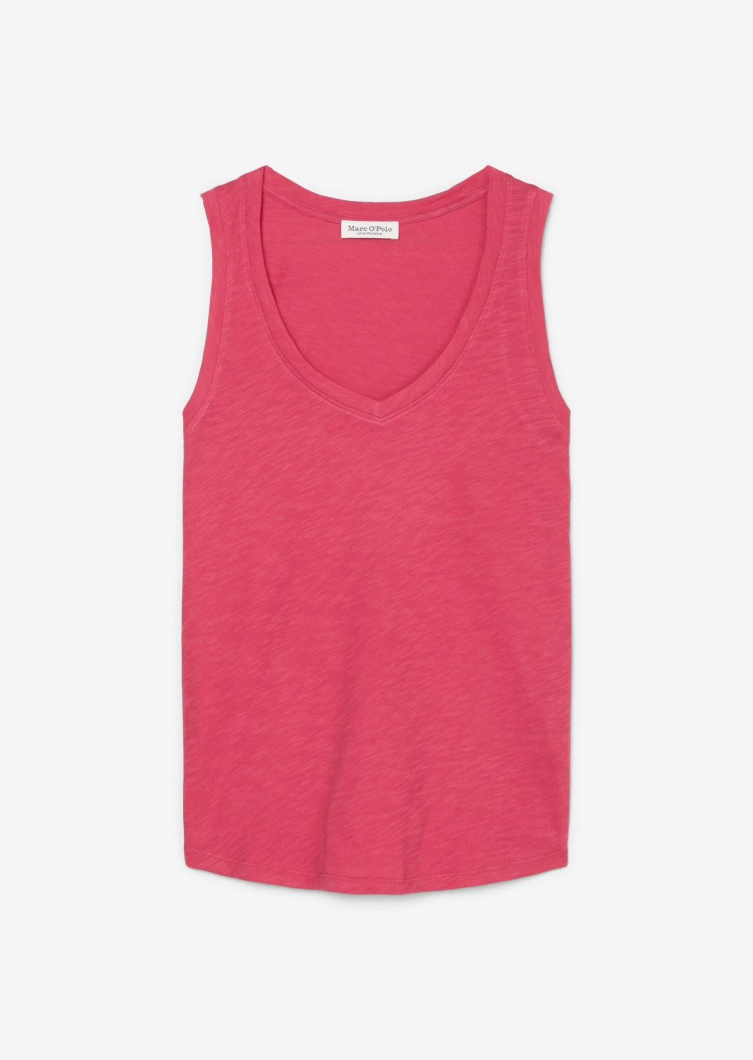 Exclusive Wardrobe Staple made of super soft slub jersey quality in fine Organic Cotton quality. Regular cut, sleeveless V-neck top with narrow shoulder straps and subtly rounded hem line. Ideal summer piece and versatile styling all-rounder with perfect wearing properties.
