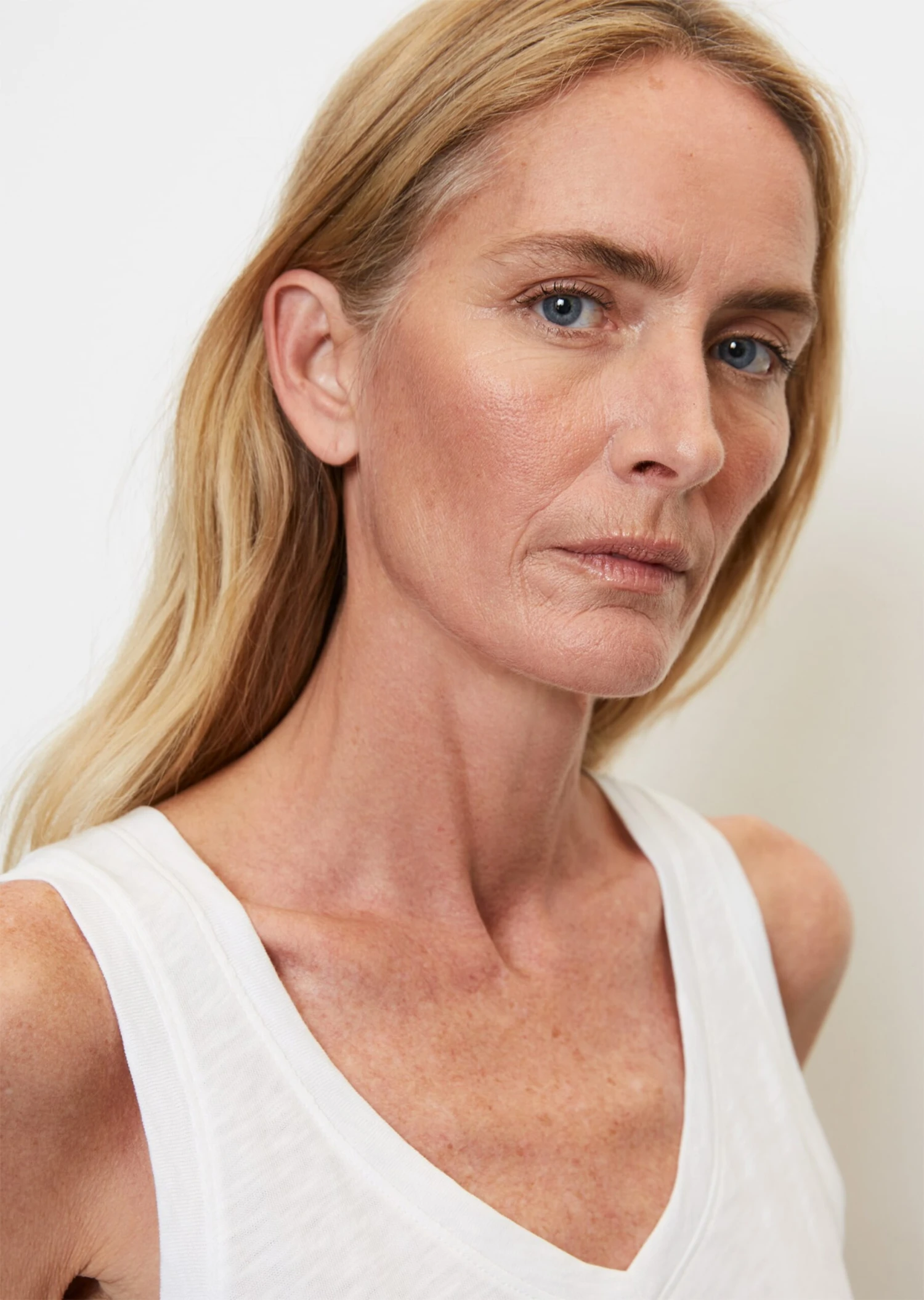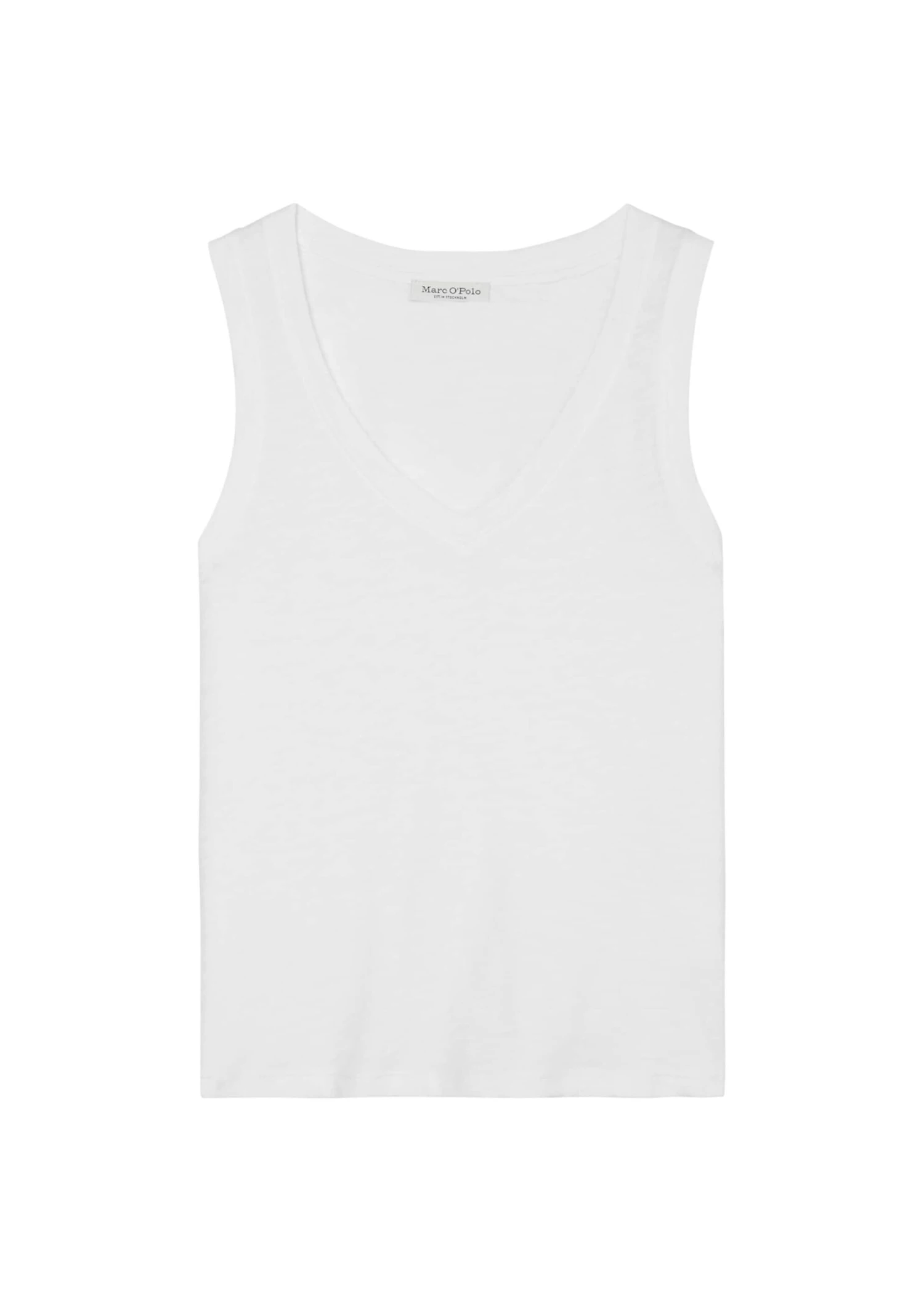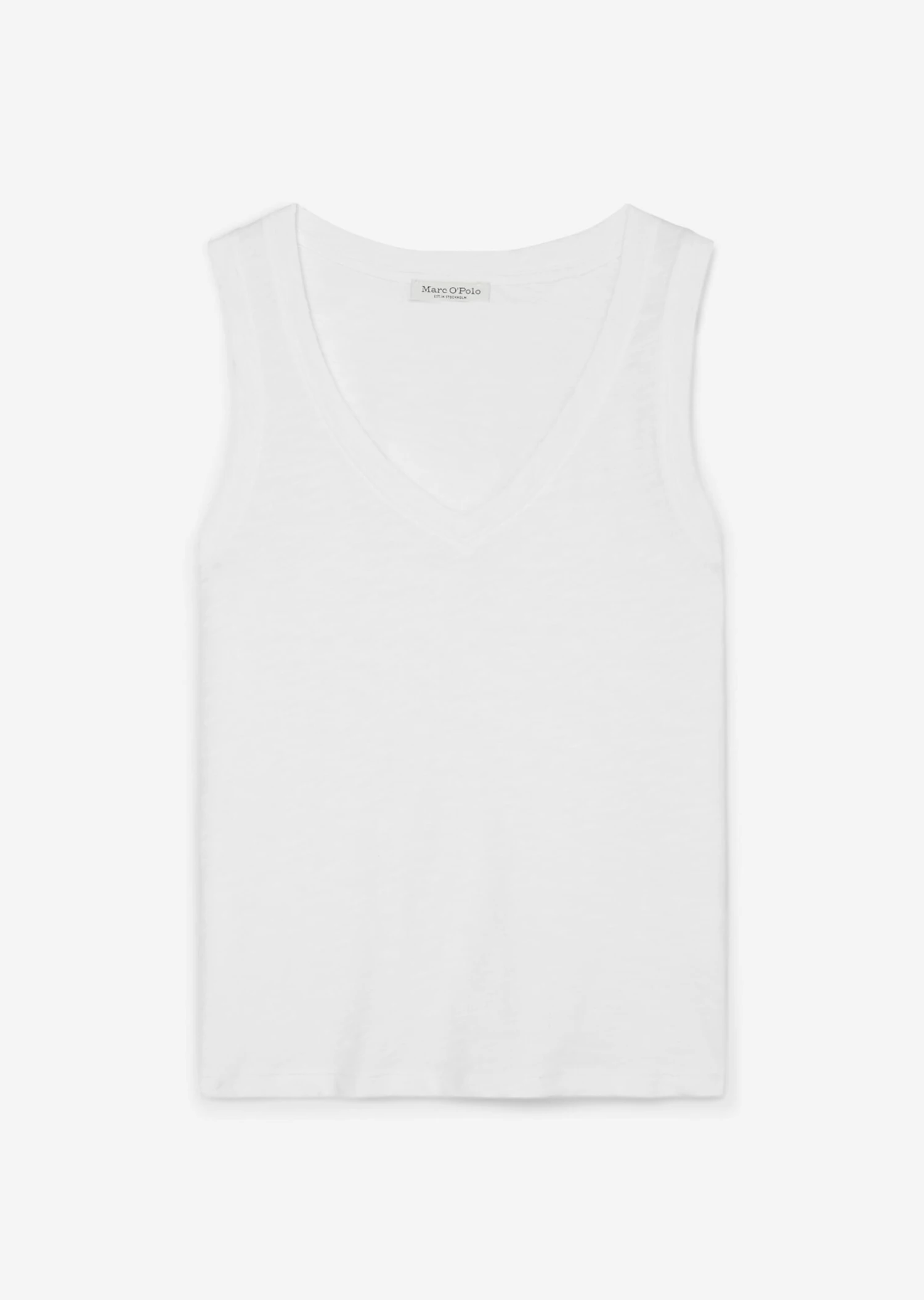 Exclusive Wardrobe Staple made of super soft slub jersey quality in fine Organic Cotton quality. Regular cut, sleeveless V-neck top with narrow shoulder straps and subtly rounded hem line. Ideal summer piece and versatile styling all-rounder with perfect wearing properties.