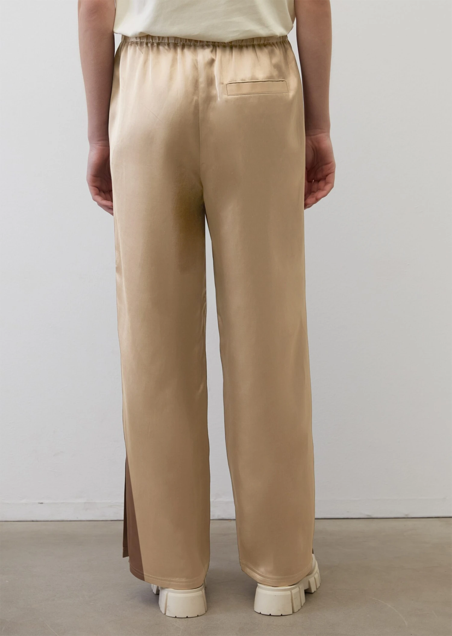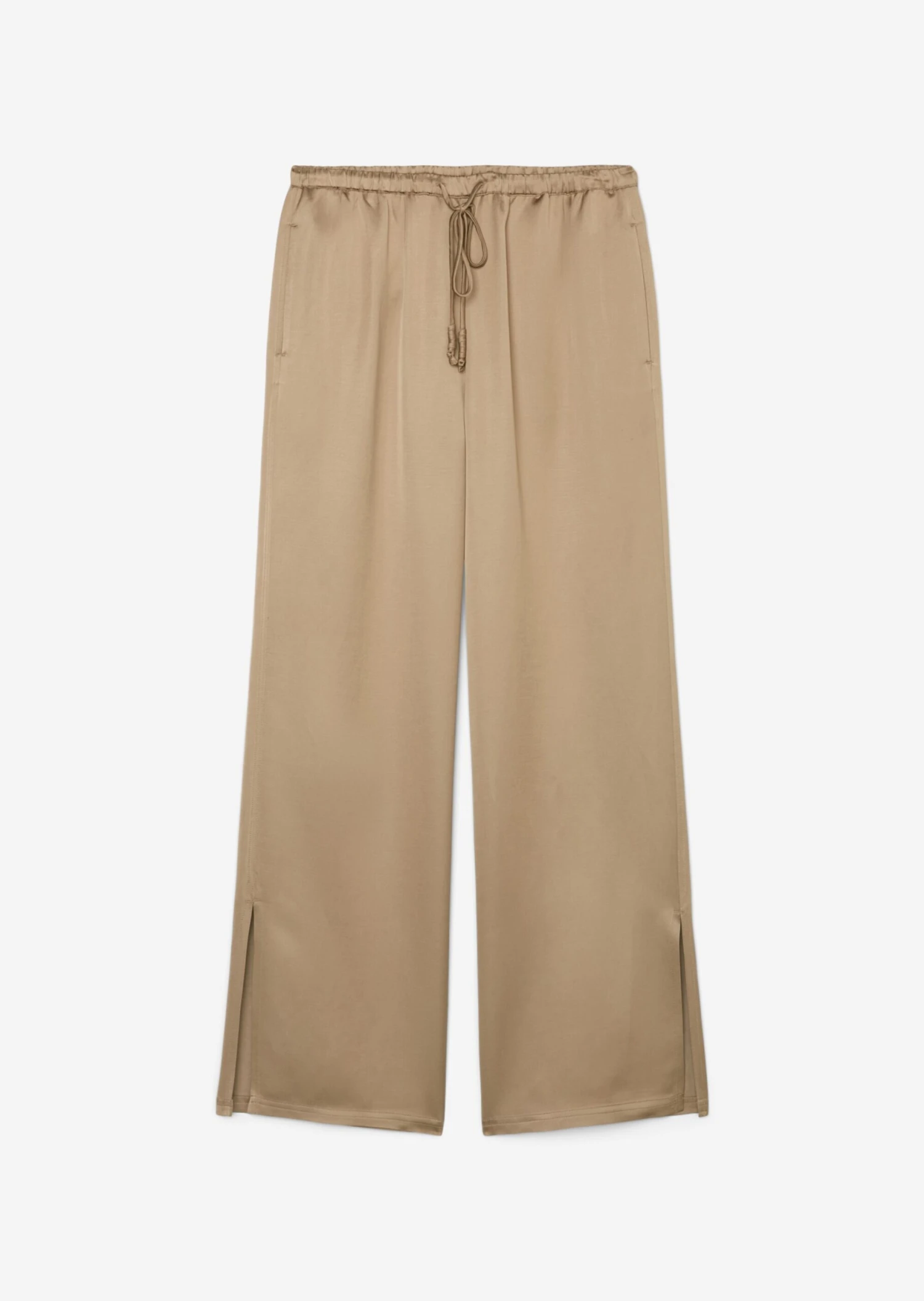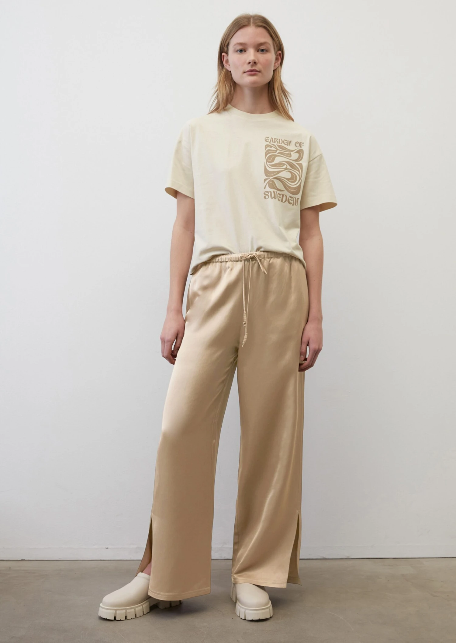 They always looks good with a white T-shirt – long and flowing wide-leg trousers made of a high-quality viscose/linen blend. The chic yet sporty design has an elasticated waistband and an elegant outer surface with a matte sheen. The high slits in the side seams of the trousers add drama as you walk while creating a super-casual look. The chic trousers have three pockets – two practical slit pockets in the side seams and one welt pocket on the back. Styling tip for a fashionable monochrome look: pair with the blouse in the matching colour and fabric.